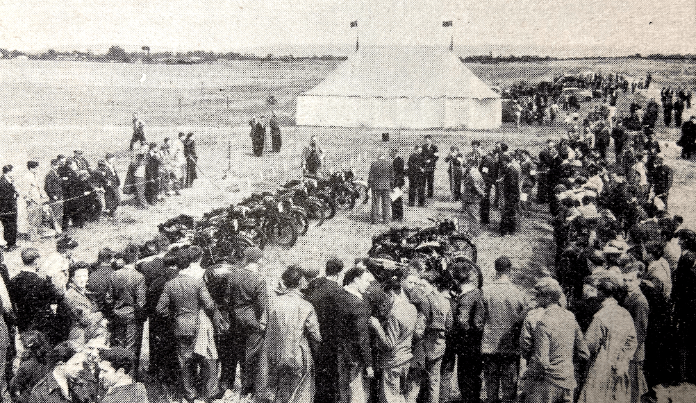 organised in commendably slick fashion, and spectators could walk all round the outside barrier of the circuit to see the racing at any point they wished. The only mishap was a public address system which functioned sporadically as a result, no doubt, of heavy overnight rain. A circuit roughly D-shape had been selected. The principal runway, used as the straight, is 1,300 yards long, with the starting line about half-way. At the end is a slow, almost-hairpin turn to the right, then a right-angle left bend, followed by four easy right-hand curves and a right-angle corner to join the straight. The first two of the easy curves could be taken in one graceful sweep at very high speed—almost full throttle in third gear on even the faster machines—and it was this merit which endeared the l¾-mile circuit to so many riders and spectators. The width of the roads permitted riders to pass comfortably, and the surface, part concrete and part tarmac, gave surprisingly good wheelgrip even when damp, as Harold Daniell’s lap of over 78mph indicates. Heavy rain had fallen the previous evening and night, and the roads were in very wet condition for the two hours of practising before the start of the meeting. Nevertheless, there were some noticeably zestful laps put in during practice, and the resulting cacophony must have been a good match for the best (or worst) phons