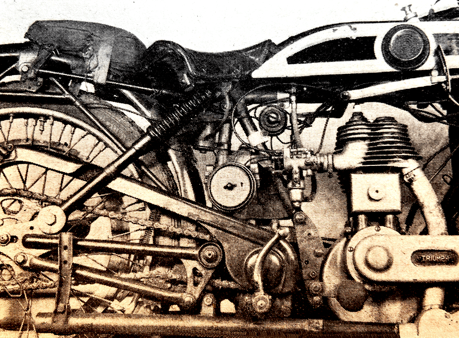 TRIUMPH HAD LED the way with its vertical twins; now it led the way again by offering them with sprung-hub rear suspension. It was a clever way of incorporating rear suspensioninto a rigid frame but with only a couple of inches of undamped springing it was a blind alley (and stripping down a sprung hub has ben known to send springs through shed roofs).