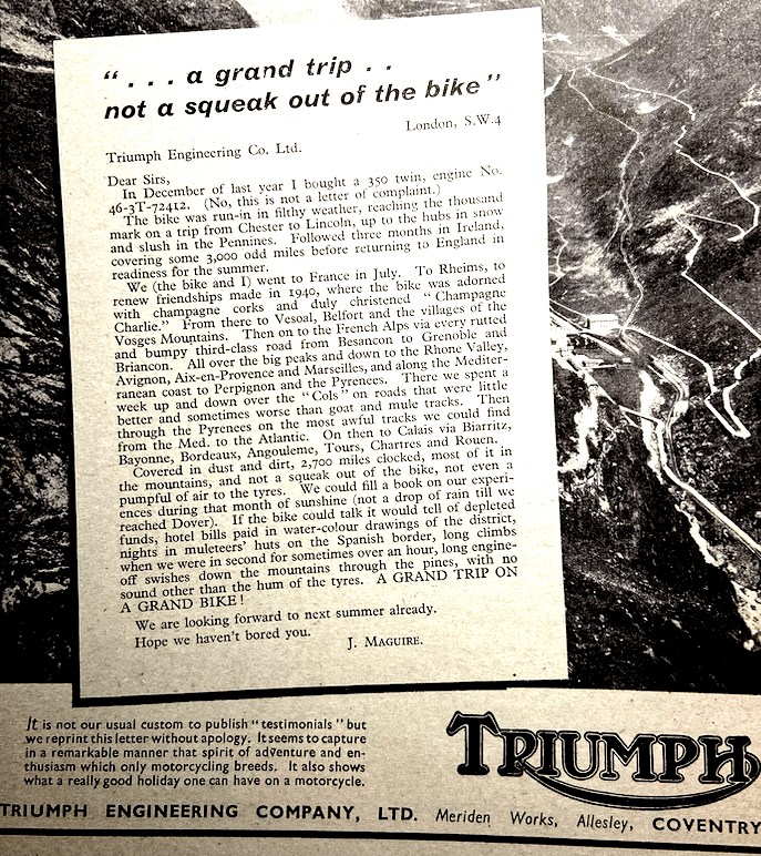 “AFTER 22 YEARS of motor cycling and car driving I have at last to write a letter re ‘our’ sport. Having been a pilot during the war 1 have now succumbed to the joys of a 1946 3T Triumph Twin. What a bike! Smooth and silent, with all the performance one desires and only one criticism to make—the omission of a prop stand. As I use the machine for business in all weathers, with frequent stops, I am constantly searching for kerbs of convenient height to rest the machine against, not being a superman. I wonder if anyone will be enterprising enough to found a club for Triumph Twin owners? I should imagine a club run mainly on social lines would score an instant success with the Twin owners.