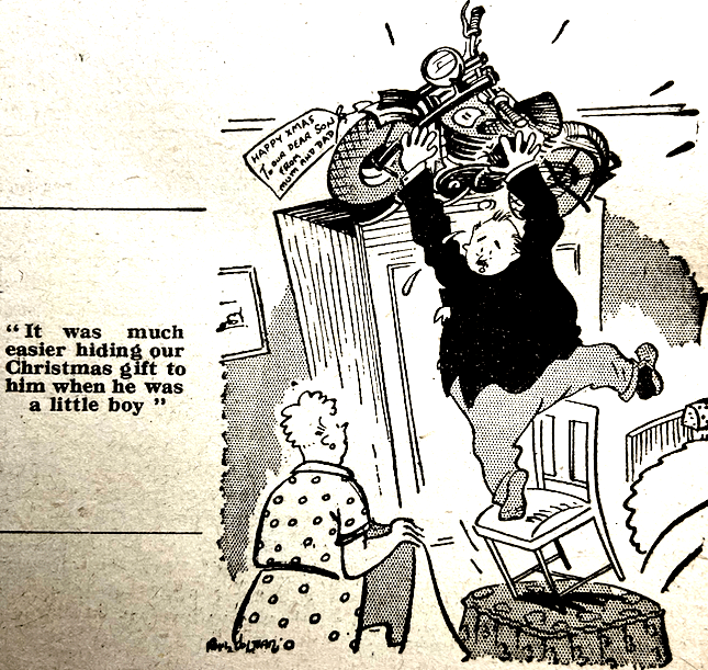 “HERE’S WISHING ALL OUR READERS the best Christmas possible in these weird days. At least they won’t have a hangover next morning, neither are they likely to suffer from what the patent medicine advertisements call ‘that feeling of fullness after eating’—two familiar symptoms at pre-war Yules. Worse still, some enthusiasts have no real home, nor any rapid prospect of a real home; while an unusual percentage—for so-called peacetime—are far away overseas, some still awaiting demob, or newly dispatched under the Conscription Act. Poor old England, after bearing the worst brunt of the war, still has to reassume her old role of world policeman. So we have plenty of grouses. But as a nation we are never quite happy unless we’ve something to grumble about. Two thoughts sustain us in enduring present tribulations, minor or major. First, we stood alone between mankind and the most devilish threat that ever confronted us. Second, the measure of our present discomforts and shortages is the measure of our continued effort to build a decent world. Grim, perhaps. But possibly more wholesome than full tummies and full pockets. Anyhow, may past achievements and future hopes sustain you all in a Christmas which may hardly be traditional but at least is by no means to our discredit.”—Ixion