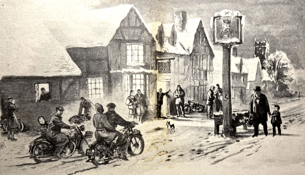 “OLD FRIENDS HAVE RETURNED. Many signposts are back again at their accustomed places by road and by lane. They have returned refurbished with fresh black and white paint; and some of them must have needed it very much. After all these years it is good to see the signposts standing like quiet sentries pointing the way to remote hamlets that we must visit one day when there is time. But, best of all, there is the joy of knowing that we now can get astride our mounts and re-explore this land of ours. We are now at liberty to think again of the things we have always cared about: of leafy Warwickshire lanes and a countryside patterned with tall, stately elms, placid rivers, and streams; of high Cotswold places, aged yet ageless, with beautiful grey houses, and tree-enfolded churches set in the quiet valleys; of the green hills of the Borderland, gorse-crowned and very lovely; of downland and wold; and, above all, of the fretted sea-coast whose attraction for us never ceases. In out-of-the-way places, where memorable names are written up on the modest signposts, we can regain the peace of road and lane, and enjoy the varied face of the English countryside.”—Aella