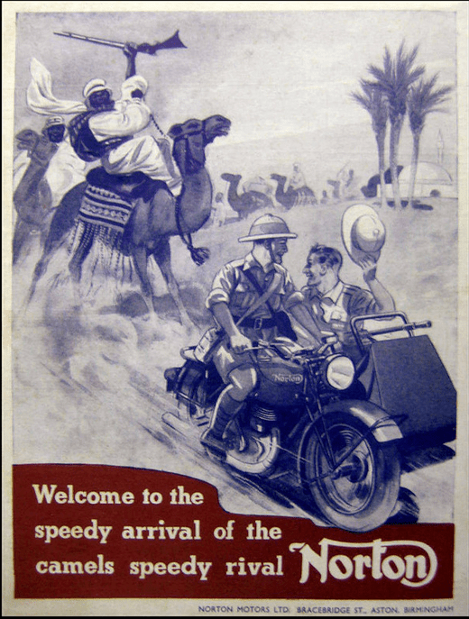 Being an RAF pen-pusher wasn’t much fun at first, but when the Squadron moved up into the desert I scrounged a 350 Triumph that the MT boys hadn’t much use for.I was roped in for convoy work during the advance; when we settled down Benghazi way I still managed to hang on to the bike. Later on there was a flap and one of those ‘strategic withdrawals’ began. We retreated towards El Adem. There’s a pretty tough escarpment in the last stretch. It’s a hard pull and the road twists like the devil, while dust-storms reduce visibility to yards; so I stopped the Triumph at a bend on the worst part of the climb to check the trucks past. The last one had just ground its way over the pimple when an Army DR on a Norton flicked up the hill and round that corner as though he were sprinting along Brighton front. As he disappeared from view I heard his motor cut. I started off and very soon found the Army type sorting over his tool-kit. I stopped again. It was Harry Chater. We recognised each other simultaneously, but Harry spoke first. He was in a