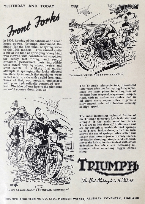 “IT WAS A LARGE and ostentatious garage, the latest post-war models glittered in the windows, beckoning siren-like to impecunious youth to sample their chromium loveliness. Behind this bright façade lay a stock of second-hand machines of varying pedigrees, and mostly in fair running order. One might compare this show-room with the second floor of a boarding house ; not, perhaps, the best rooms in the house, but at least adequate. Further back was the repair shop, and, to put it bluntly, the assembled junk of years. A harsh voice broke the stillness of the early morning. It was that of a camshaft 350: ‘I’m just about browned off with this place, and with my young man. Calls himself a rider. My foot-change! Can’t even decoke me himself, but has to leave me here. Afraid to soil his lily-white hands, I suppose.’ ‘Ah, things aren’t what they were, nor people either,’ replied a very elderly Zenith Gradua from the murk of a distant corner. ‘I shouldn’t be surprised if you were exchanged any day for one of those new-fangled twins. Not that I’ve got anything against twins being one myself, but what I say is that you young folk lack character, the same as your owners. Now look at me. I may not be a beauty, judged by modern standards, but I’ve got temperament, which is one thing you moderns lack.’ ‘Temperament?’ replied the camshaft tartly. ‘I don’t know so much about that, you old stringbag. I had a whale of a time last week. Oiled up a treat in the middle of Oxford Circus in the rush hour. Laugh! Never laughed so much in all my life as when my young man had to push me to a side turning and put in a soft plug. You should have heard the remarks the taxi drivers passed.’ ‘You young lassies don’t know the meaning of good honest-to-goodness laughter. You should have seen me smash up a belt twice in an hour. Not a mere rubber belt, either, but a hinged leather Whittle. Though I suppose it’s too much to expect you to know that name. Push you round a side turning, my dear! My boy had to push me five miles before breakfast on that occasion. But he loved me in a way your man will never love you. Look at my lines. Can you copy those curves?’ She coyly showed off a pair of delicately moulded Bramptons, and dropped ‘super-sports’ handlebars, liberally arrayed with throttle and air levers, exhaust-lifter and magneto control, and festooned with cables and gas-tubes like the head of a frowsy old female such as she had become. ‘You don’t understand modern conditions,’ said the camshaft model. ‘We stand for mechanical efficiency. You can’t blame me if my young fellow tries to get me through the West End on a hot plug, can you? And no one can show me a tail light on a blind in the country. Compare yourself with me? You drink too much. Always did, I reckon. Look at your tyres. Thin, beaded relics. No wonder you chucked them off unless they were kept on with security bolts!’ ‘What you don’t seem to realise, my dear,’ said the Zenith, sweetly blowing from the elevation of her 30 years’ experience, ‘is that it was all these things, the delightful uncertainty of every journey, that kept our young men true to us. You talk about a breakdown in Oxford Circus with pride! I call that bad manners. We used to break down regularly in the heart of the country, miles from anywhere, and that did us both a lot of good. No. I would run sometimes like a dream, sometimes like a nightmare. That was just a part of my attraction. Talking of comparisons, look at your own neat four-speed gear box—and then look carefully at my Gradua.’ The camshaft model did so, unwillingly, as though afraid to see some detail in which the old girl might be superior. She looked long and carefully, but could only make out a somewhat corroded mass, half concealed behind a mask of sludge. ‘Your box—so what?’ she asked cynically. ‘What about your old box?’ Don’t you see, my dear young thing,’ replied the Zenith, in an even sweeter tone, ‘don’t you know? Even this is infinitely variable.’ Away in a distant farmyard a rooster crowed, beckon-‘ing a new dawn. Silence descended on the garage, broken only by the rhythmic drip of oil from a broken sump.”