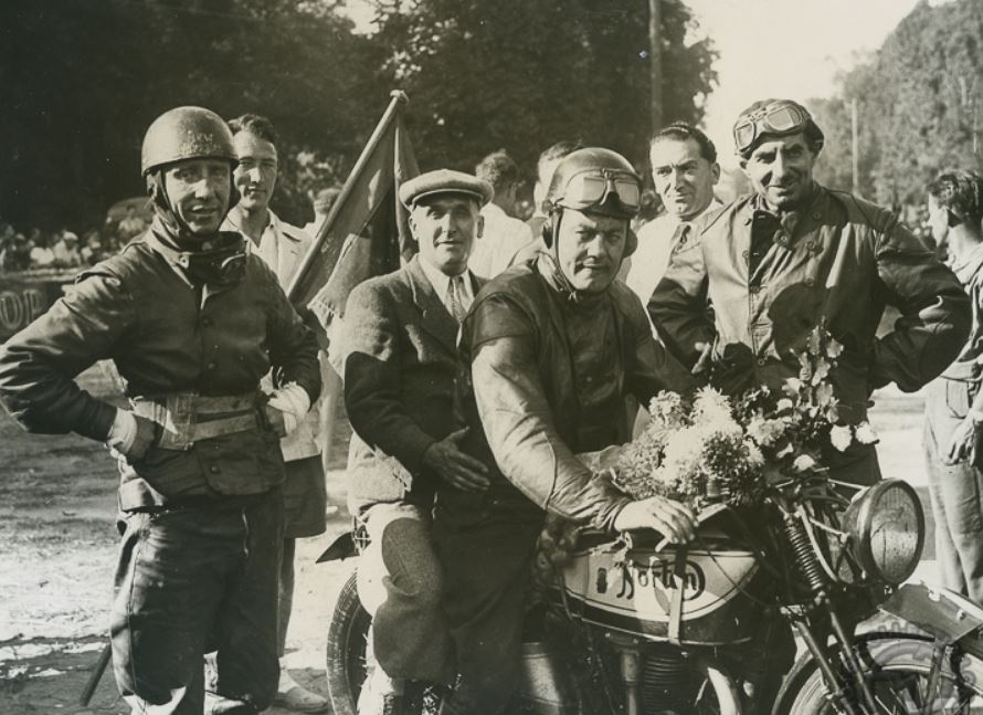 THE ONLY FOREIGN BIKE entered for the Senior TT was Freddie Frith’s Guzzi twin, which crashed out during practice, but three Guzzi singles entered the Lightweight, all with British riders. There were no foreign bikes in the Junior, though Czech ace Frans Juhan rode a Velo. The Senior, Junior and Lightweight TTs were run together (four laps for the 500s and 350s; three for the 250s). The Italians took over where they’d left off in 1939 with the wonderfully named Manliff Barrington and Maurice Cann riding their Guzzis to 1st and 2nd spots in the Lightweight TT, followed home by Ben Drinkwater’s Excelsior. It was also business as usual in the Junior with a hat-trick for Velocette, courtesy of Messrs Foster, Whitworth and Weddell. In fact there were six Velos in the top 10, with four Nortons to ram the home the British-is-best message. BMW, having won the 1939 Senior with its blown twin, was conspicuously absent leaving Harold Daniel to lead the 500s home on his Manx Norton with TT debutant Artie Bell just 22 seconds behind him on another Norton. Also racing on the Island for the first time was Peter Goodman, grandson of Velocette’s founder, who was third on his KTT. Nortons filled the rest of the top 10 places, apart from an Ajay in 9th spot. Brits also dominated the Clubman’s TT. First three home in the Senior were Norton, Triump and Ariel; Junior, Norton, Norton AJS; Lightweight, AJS, Velo, Velo. Clubman’s Senior TT winner Eric Briggs had a good year; he returned to the Island for the Manx where was managed a Senior/Junior double to win three Mountain Course races within three months.