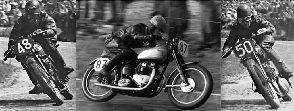 Laxey. Jock West comes in after a first lap in 1hr 24min 19sec, but after a longish stop at his pit sets off again. No hope, of course, but perhaps he’s going to make the most of the TT course for test purposes He says he’s going to have a run for his money, anyway. Now back to the leaders—Artie is at the Mountain and Ken and Harold are both on the Kirk Michael-Ramsey stretch. Clocks on Ken and Harold at Ramsey. As they are Nos 62 and 72 respectively there is, of course, two and a half minutes between them on time. Here’s Ken—click the watch—and here’s Harold, 2min 27sec after him, so leading him by 3sec at Ramsey as against 2sec at the end of the third lap. Some race, this ! Norton 1, 2, 3, and 4, Velocette 5, and AJS 6. Bell flies past the its at the end of his fourth lap, and is shown at Ballacraine as Bills comes past the pits. Bills is now lying third on the roads find—wait for it!—he is leading Bell on the four laps by two seconds! Meanwhile, Harold is at Governor’s Bridge—and here he is, thumbs up. Nortons are certainly avenging themselves to-day! What a race! Harold, partly due to his quick pit stop, is in the lead again, 18sec ahead of Ken, with a fourth lap in 27min 57sec, including a pit stop! Artie Bell’s fifth lap is the fastest of the day so far—26min 56sec—at 84.07mph. George Formby in the officials’ box: “It’s chompion up here!” ” Did they go as fast as you did, in No Limit “Oh, no, not quite.”…and lots of back chat. George was introduced in person whilst one of his own records (You’ve been a terrible, terrible long time gone) was being played. His last crack was—”I’d better let myself carry on singing!” (Roars of applause.) Ken Bills tears past—Harold tears past—only about 2min behind him. So Harold is leading Ken by half-a-minute odd—and—here’s news, Harold is leading the race by 9sec, with Artie in second place. Jock West is having a ride for his money! His third lap took 27min 5sec—second fastest of the day, so far. Good enough, Jock! Peter Goodman (Velocette) is coming up. He is now only 27sec behind the third Norton rider. Whereas on lap 4, when lying fifth, he was 1min 9sec behind. His last lap, 27min 7sec, is third fastest of the day, according to our reckoning. Here’s Artie at the end of his sixth lap. He draws in for supplies and is away in 30sec. And here’s Ken Bills—stop—fill-up—and off—in 17sec. And here’s Harold—13min after Ken, and even quicker on the getaway! So Artie is leading Harold by one second! And the point is—does Harold know? If he does—if his pit attendant has worked it out from Creg-ny-Baa times, and got it over to him—we can expect fireworks on the last lap. Artie’s at Ramsey, Harold’s at Kirk Michael. Stop watches on them at the Mountain Box. Here’s Artie—and, meanwhile, news that Ken Bills has retired at Union Mills with engine trouble. That puts Peter Goodman in third place. And here’s Harold at Ramsey. Wait for him at the Bungalow. Here he is just over seven minutes behind Artie, according to the clocks, and as he started 7¾min behind him he has half-a-minute’s lead. Here comes Artie—first man to finish a post-war Senior TT race. So it’s a Norton win—whether it’s Artie or Harold. And it looks like Harold! Anyway, it’s Norton’s 20th