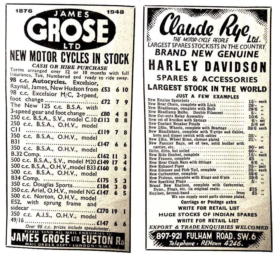 FROM THE MOTOR CYCLE’S annual Buyers’ Guide comes this overview of the British motor cycle industry four years after peace broke out…Aberdale, London N18: 98cc ts single. Ambassador, Ascot, Berks: 197cc ts single. AJW, Bournemouth, Dorset: 500cc ohv single and sv single. AJS (AMC), London SE18: 347 and 498cc ohv singles, 498cc ohv vertical twin, 348cc ohc. Ariel, Selly Oak, Birmingham 29: 997cc ohv square four, 498cc vertical twins, 347 and 497cc ohv singles, 598cc sv single. BSA, Small Heath, Birmingham 11 123cc ts single, 249cc ohv and sv singles, 348 and 499cc ohv singles, 499 and 591cc sv singles, 495cc ohv vertical twin. Corgi, Southport, Merseyside: 98cc ts single. Cyc-Auto, London W1: 98cc ts single. Douglas, Bristol: 348cc ohv flat twins. Excelsior, Birmingham 11: 98, 122 and 197cc ts singles. DOT, Manchester 15: 122 and 197cc ts singles. Francis-Barnett, Coventry: 98, 122 and 197cc ts singles. James, Birmingham: 98, 122 and 197cc ts singles. Matchless (AMC), London SE18: 347 and 498cc ohv singles, 498cc ohv vertical twin. New Hudson (BSA Cycles), Birmingham 11: 98cc ts single. Norman, Ashford, Kent: 98, 122 and 197cc ts singles. Norton, Birmingham 6: 490 and 596cc sv singles, 490cc ohv singles, 348, 490 and 499cc ohc singles, 497cc ohv vertical twins. Panther, London EC4 (but built in Cleckheaton, Yorks, ba gum!): 248, 348cc and 598cc ohv singles. Scott, Shipley, Yorks: 596cc ts wc parallel twin; Royal Enfield, Redditch, Worcs: 125cc ts single; 346 and 499cc ohv singles; 496cc ohv vertical twin; Sun, Birmingham: 98cc ts singles. Sunbeam (BSA), Small Heath, Birmingham 11: 487cc ohv in-line twins; Swallow Gadabout, Walsall, Staffs: 122cc ts singles. Tandon, London EC4: 125cc ts single. Triumph, Coventry: 349 and 498cc ohv vertical twins. Velocette, Hall Green, Birmingham: 149cc sv wc flat twin, 348cc ohc single, 349cc ohv single. Velosolex, London NW1: 45cc ts single. Vincent HRD, Stevenage, Herts: 499cc ohv singles, 998cc ohv V-twins. Wooller, London EC2: 500cc ohv flat four. Zenith, London, SE11: 750cc sv V-twin.