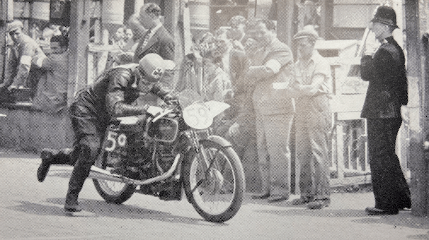“IN 1948 THERE WAS considerable ‘feeling’ about the Clubman’s TT races. It was urged that more of the boys should be given a chance to have a ride and that 500cc models should not have to compete on equal terms with 1,000s. Much was said and written on these matters and in the winter a meeting was held in Birmingham between officials of the A-CU, prominent personalities from the Isle of Man and a few—a very few—riders. The absence of many of those who had said and written so much was regrettable, but the meeting bore fruit in that for 1949 it was decided that four Clubman’s races should be held, two in the morning and two in the afternoon, with a maximum of 100 competitors in each period—ie, a total of 200 in all as against the 100 of the previous year. The additional race was, of course, for 1,000cc machines. In 1948 the Junior and Senior Clubmen had covered four laps and the Lightweights three, but in 1949, with the two sessions, it was felt that there would not be time for races of this length. The Lightweights, therefore, were required to cover two laps only and the other classes three each…the total entry was 174, made up of 12 in the ‘1,000’ and 85 in the Junior, run concurrently in the morning; with 55 in the Senior and 22 in the Lightweight in the afternoon. The Supplementary Regulations read: ‘Every motorcycle entered for these races shall be a fully-equipped model…according to the manufacturer’s catalogue or a complete published specification, which shall have been published before 24th November, 1948, and a copy of such catalogue or specification shall have been deposited with the A-CU nor later than the 1st March, 1949. At least 50 of each model entered shall have been produced by the manufacturer and sold and delivered to the general public in the United Kingdom before the closing date of entries. No motorcycle manufactured before the 1st September, 1937 shall be eligible. The standard equipment of every motorcycle entered for these races must include dynamo, electric lighting, kickstarter, silencer(s) and fully enclosed primary drive except in the cases of motorcycles having external flywheel(s) or where