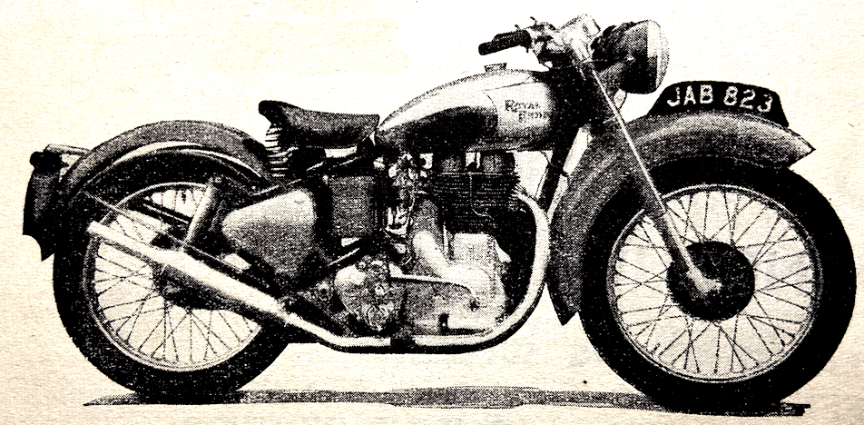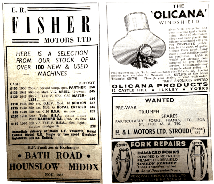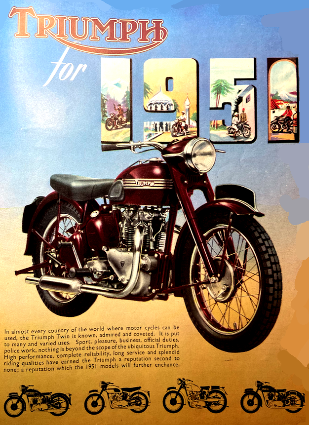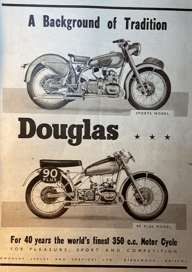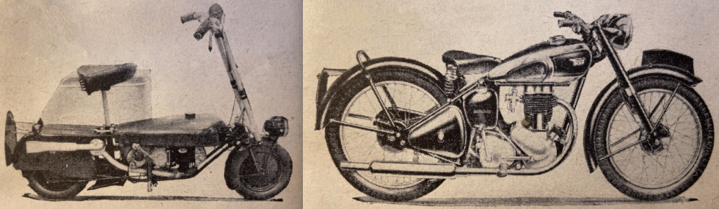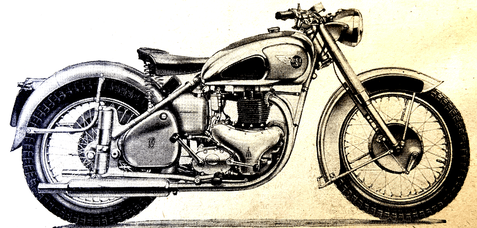 “‘BIKES OF TODAY are all very well,’ complain the traditionalists, ‘but they have no character—Yamahas and Suzukis, and shaft drive, and self-starters, and winkers; they cannot be called real motor cycles. Now, take an old B31 Beesa…Each enthusiast has his own reasons for looking back to the 1950s with a particular kind of affection. Japanese competition was then no more than a speck on the horizon, Germany and Italy were turning out some attractive machines, but above all it was the traditional British single and vertical twin which dominated the motor cycle scene, both at home and abroad. However, during the early 1950s, buying a new machine was not so simple as all that. The demand was certainly there and, on the face of it, Britain’s manufacturers should have been raking in fat profits. But those who are forever carping that British industry should have been investing more heavily in new equipment during this period, would be advised to take a closer look at the country’s economic situation. The struggles of the Second World War had left the nation in a sorry state, and the immediate need was to build up reserves of foreign currency. For that reason, factories both big and small were constantly being urged to export more and more of their production. Metals were in short supply, and stocks were only obtainable by flourishing a government permit—and, usually, such permits were granted only if the firm concerned could produce an order from an overseas customer. Nor were export markets easy to find, because often other countries would either refuse entry to British products or (as in the case of the USA) place a heavy import duty on them. There were quotas and trade agreements to be negotiated and honoured, and it was not really surprising that our factories should find their major overseas markets in the countries of the Commonwealth. Indeed, in 1950, the first year of this decade, Britain’s biggest customer for motor cycles was Australia. However, the American market was just beginning to move, thanks in some measure to the efforts of Edward Turner and the Triumph company. Over a very long period, American riders had grown accustomed to the oversize, overweight V-twins of their own industry, but wartime experience had shown them that bigness is not necessarily a virtue, and that there was a deal of enjoyment to be had from a relatively light, and vastly more manoeuvrable British machine. Nevertheless, the vast distances of the United States permitted bikes to run at higher sustained speeds than was possible in Britain’s crowded land, and it was this factor which led British factories to introduce such models as the 650cc Triumph Thunderbird, and the BSA Golden Flash of the same capacity. It might appear that every factory worthy of the name felt honour-bound to follow Triumph’s lead and include a vertical twin in its post-war range, but that is not strictly true because there were some firms striking out along individual lines—Douglas, for instance, with a 350cc transverse flat twin and torsion-bar springing, Sunbeam with an in-line, ohc twin and shaft final drive, and Velocette, casting aside its pre-war traditions and staking everything on a little water-cooled, side-valve twin in a pressed-steel frame. In the industry as a whole, there was a tendency towards grouping. Ariel and Triumph had long been linked under Jack Sangster’s banner, and now the giant BSA firm joined in, taking Sunbeam with it. The London-based AMC group, already makers of AJS and Matchless, added Francis-Barnett, then James. What with material shortages, international tariff problems. labour difficulties, and the continual demand for more bikes than they were able to produce, the factories just had not the resources available to cope. That is why, with the inevitable disruption a London Show would have caused, there was no major Earls Court Show in 1950… More and more firms were adopting rear springing, albeit plunger type instead of the full pivoted rear fork (although Triumph managed to get extra mileage out of their old rigid frames by adding a rear wheel which encompassed rudimentary springing within the hub). The traditional hearth-brazed lug frame was being ousted by the all-welded frame, due to advancements in steel-tube technology through wartime experience. In trials and scrambles, the big four-stroke single was pre-eminent, but whereas in earlier days competing machines were mainly roadsters stripped of lighting and equipped with suitably knobbly tyres, purpose-built competition bikes were now emerging…The time-honoured Magdyno, a combined magneto and dynamo that had originated in the early 1920s, was on its way out and, instead, the alternator (the rotor of which could be mounted directly on the engine shaft, so avoiding the necessity of providing a separate drive) was making headway. It was not all big stuff, of course. There had long existed a demand for a simple, ride-to-work lightweight, and in the course of any trip by (steam) train, nearly every signalbox along the way would be seen to have a small two-stroke, usually an Excelsior or a James, propped up against the outside stairway. Mostly these were much of a muchness, powered by reliable if none too exciting Villiers two-stroke units, but in 1948 the BSA Bantam had come upon the scene, initially for export only but later for general sale; the Bantam was a frank copy of the pre-war German DKW (as was the 125cc Royal Enfield ‘Flying Flea’, used initially by the Airborne Forces but continued into civilian production as the Model RE)…At the start of 1950, the British motor cyclist was still bedevilled by fuel rationing, but in June of that year came the welcome news that restrictions on private motoring were being lifted at last. True, branded fuel had yet to return, and all that the pumps contained was the dreaded 75-octane ‘Pool’, but at least coupons were to be torn up and the enthusiast could make the 