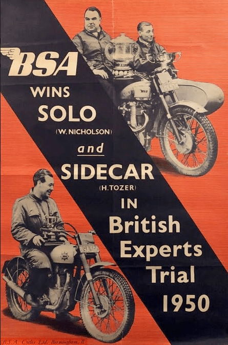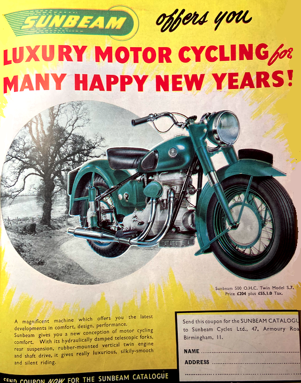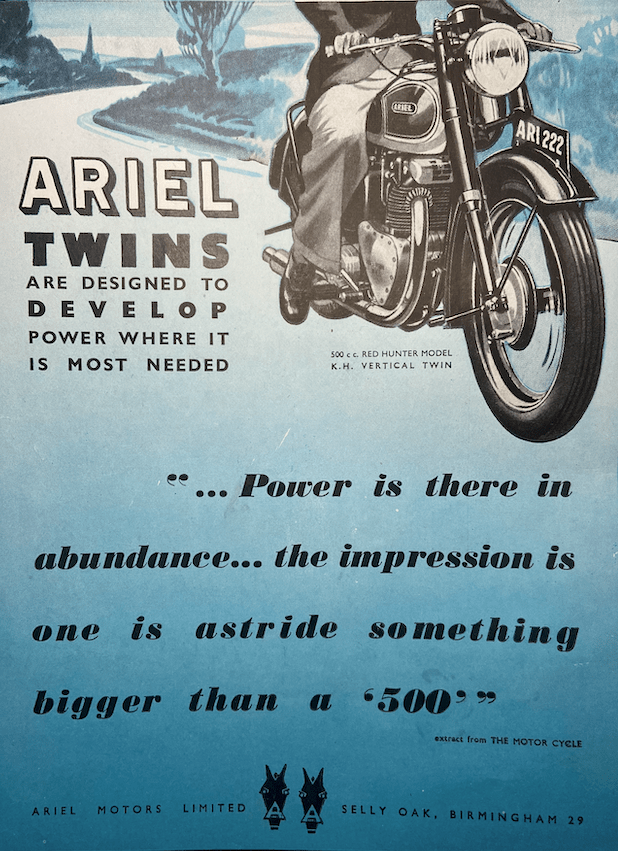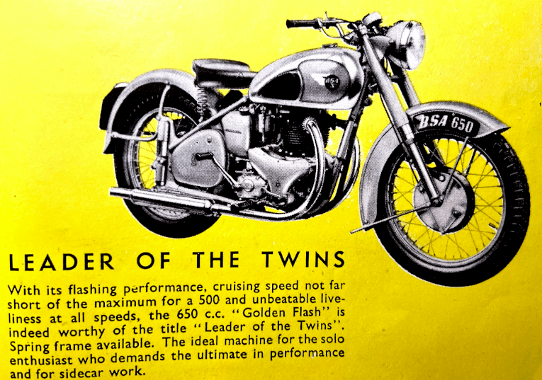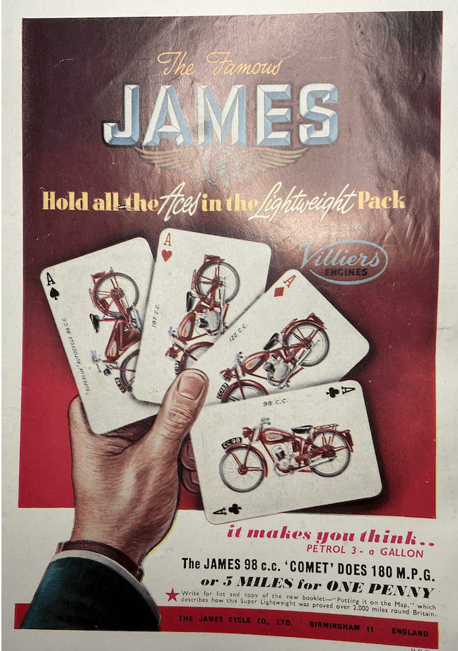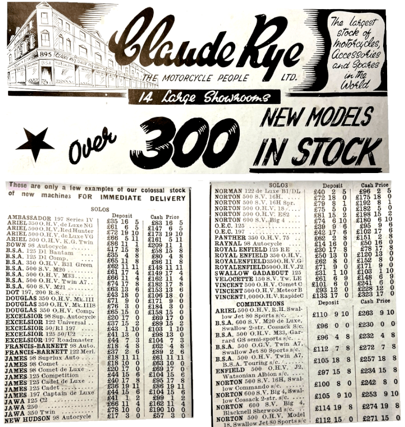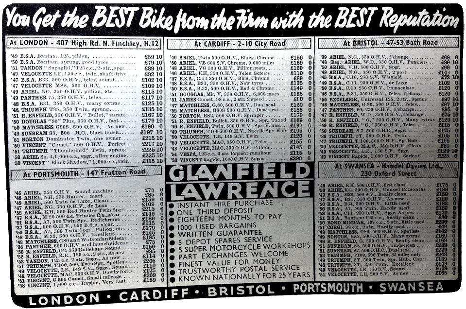 “‘BIKES OF TODAY are all very well,’ complain the traditionalists, ‘but they have no character—Yamahas and Suzukis, and shaft drive, and self-starters, and winkers; they cannot be called real motor cycles. Now, take an old B31 Beesa…Each enthusiast has his own reasons for looking back to the 1950s with a particular kind of affection. Japanese competition was then no more than a speck on the horizon, Germany and Italy were turning out some attractive machines, but above all it was the traditional British single and vertical twin which dominated the motor cycle scene, both at home and abroad. However, during the early 1950s, buying a new machine was not so simple as all that. The demand was certainly there and, on the face of it, Britain’s manufacturers should have been raking in fat profits. But those who are forever carping that British industry should have been investing more heavily in new equipment during this period, would be advised to take a closer look at the country’s economic situation. The struggles of the Second World War had left the nation in a sorry state, and the immediate need was to build up reserves of foreign currency. For that reason, factories both big and small were constantly being urged to export more and more of their production. Metals were in short supply, and stocks were only obtainable by flourishing a government permit—and, usually, such permits were granted only if the firm concerned could produce an order from an overseas customer. Nor were export markets easy to find, because often other countries would either refuse entry to British products or (as in the case of the USA) place a heavy import duty on them. There were quotas and trade agreements to be negotiated and honoured, and it was not really surprising that our factories should find their major overseas markets in the countries of the Commonwealth. Indeed, in 1950, the first year of this decade, Britain’s biggest customer for motor cycles was Australia. However, the American market was just beginning to move, thanks in some measure to the efforts of Edward Turner and the Triumph company. Over a very long period, American riders had grown accustomed to the oversize, overweight V-twins of their own industry, but wartime experience had shown them that bigness is not necessarily a virtue, and that there was a deal of enjoyment to be had from a relatively light, and vastly more manoeuvrable British machine. Nevertheless, the vast distances of the United States permitted bikes to run at higher sustained speeds than was possible in Britain’s crowded land, and it was this factor which led British factories to introduce such models as the 650cc Triumph Thunderbird, and the BSA Golden Flash of the same capacity. It might appear that every factory worthy of the name felt honour-bound to follow Triumph’s lead and include a vertical twin in its post-war range, but that is not strictly true because there were some firms striking out along individual lines—Douglas, for instance, with a 350cc transverse flat twin and torsion-bar springing, Sunbeam with an in-line, ohc twin and shaft final drive, and Velocette, casting aside its pre-war traditions and staking everything on a little water-cooled, side-valve twin in a pressed-steel frame. In the industry as a whole, there was a tendency towards grouping. Ariel and Triumph had long been linked under Jack Sangster’s banner, and now the giant BSA firm joined in, taking Sunbeam with it. The London-based AMC group, already makers of AJS and Matchless, added Francis-Barnett, then James. What with material shortages, international tariff problems. labour difficulties, and the continual demand for more bikes than they were able to produce, the factories just had not the resources available to cope. That is why, with the inevitable disruption a London Show would have caused, there was no major Earls Court Show in 1950… More and more firms were adopting rear springing, albeit plunger type instead of the full pivoted rear fork (although Triumph managed to get extra mileage out of their old rigid frames by adding a rear wheel which encompassed rudimentary springing within the hub). The traditional hearth-brazed lug frame was being ousted by the all-welded frame, due to advancements in steel-tube technology through wartime experience. In trials and scrambles, the big four-stroke single was pre-eminent, but whereas in earlier days competing machines were mainly roadsters stripped of lighting and equipped with suitably knobbly tyres, purpose-built competition bikes were now emerging…The time-honoured Magdyno, a combined magneto and dynamo that had originated in the early 1920s, was on its way out and, instead, the alternator (the rotor of which could be mounted directly on the engine shaft, so avoiding the necessity of providing a separate drive) was making headway. It was not all big stuff, of course. There had long existed a demand for a simple, ride-to-work lightweight, and in the course of any trip by (steam) train, nearly every signalbox along the way would be seen to have a small two-stroke, usually an Excelsior or a James, propped up against the outside stairway. Mostly these were much of a muchness, powered by reliable if none too exciting Villiers two-stroke units, but in 1948 the BSA Bantam had come upon the scene, initially for export only but later for general sale; the Bantam was a frank copy of the pre-war German DKW (as was the 125cc Royal Enfield ‘Flying Flea’, used initially by the Airborne Forces but continued into civilian production as the Model RE)…At the start of 1950, the British motor cyclist was still bedevilled by fuel rationing, but in June of that year came the welcome news that restrictions on private motoring were being lifted at last. True, branded fuel had yet to return, and all that the pumps contained was the dreaded 75-octane ‘Pool’, but at least coupons were to be torn up and the enthusiast could make the 
