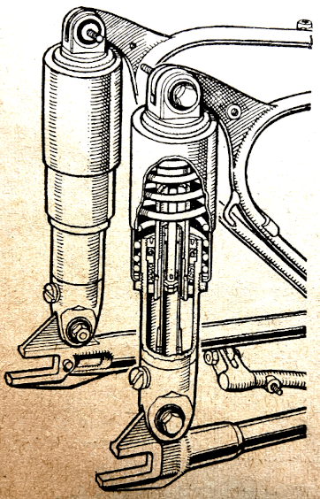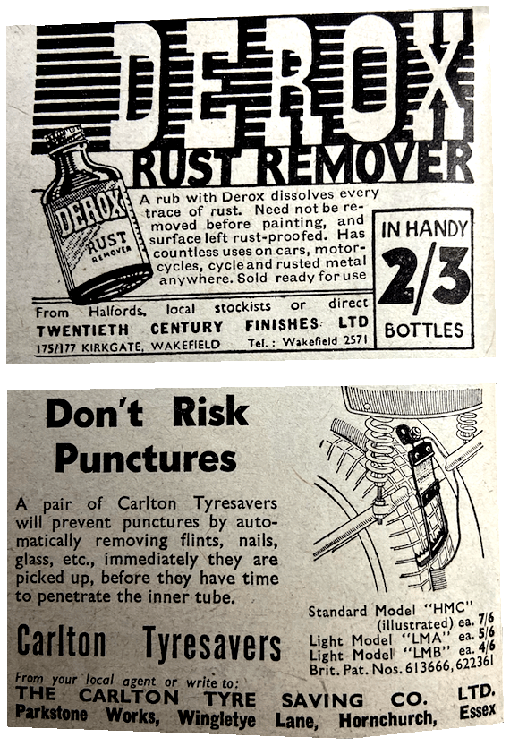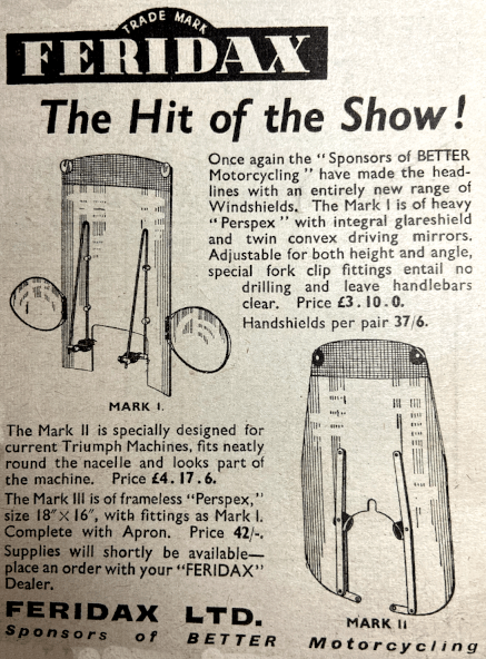 “PLUNGER-TYPE REAR-SPRINGING is shortly to be marketed by Feridax, the well-known accessory manufacturers. The total movement is 2½in. Springs are used on compression, and the rebound is hydraulically controlled. The springing will be suitable for converting any rigid-frame machine. Though the price is not yet fixed, it is said that it will come out at ‘well under £20’. New-type legshields announced by Feridax are for fitting to the Feridax crash-bar. The shields are of steel, chromium-plated, and are of smart appearance They measure 23½in long, and taper from 7½in wide at the bottom to 7in at the top. The price is 35s (the Feridax crash-bar costs 37s 6d).”