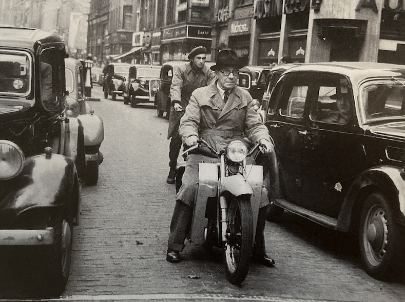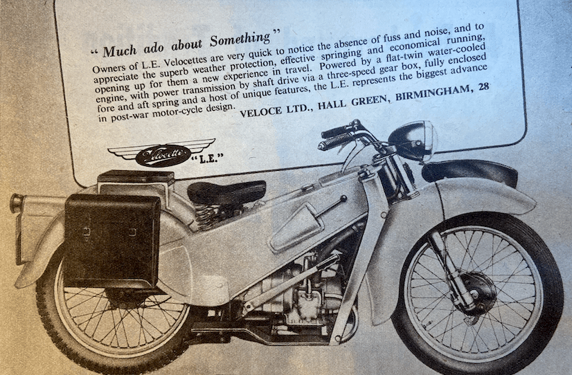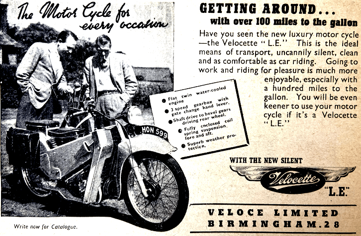 “A FEW DAYS AGO I had the pleasure of a ride on an LE Velocette. I have now an entirely new conception of motor cycling. This machine sets a standard by which all others should be assessed. The engine started effortlessly by a hand lever, ticked over silently, and took up the load in bottom gear sweetly and smoothly. The gears operated easily, and the machine floated over Liverpool roads with no reminder of the cobbles and rails. Hands-off steering is safe and true, and at 30mph in top I proceeded without noticeable sound. The machine is a demonstration LE at Victor Horsmans. By now it has been ridden by dozens of prospective buyers. The brake and clutch cables required adjustment, and the footboard could have been three inches longer for the convenience of a pillion rider—but these are trifling points. The LE Velocette is a remarkable motor cycle.