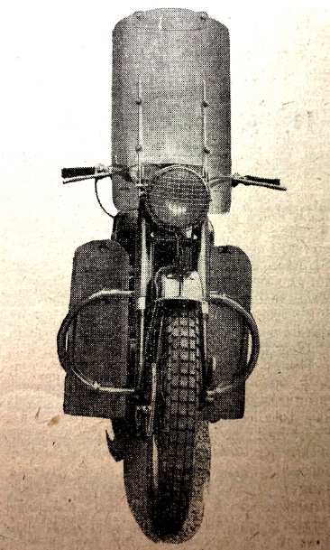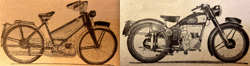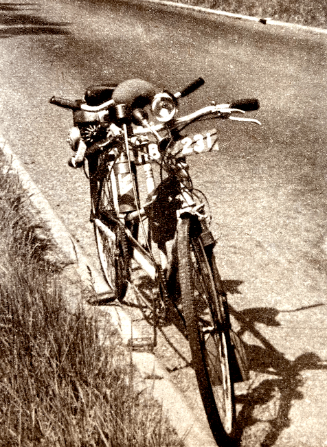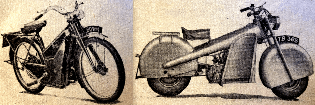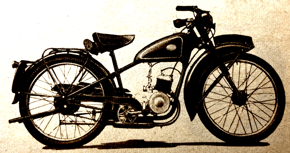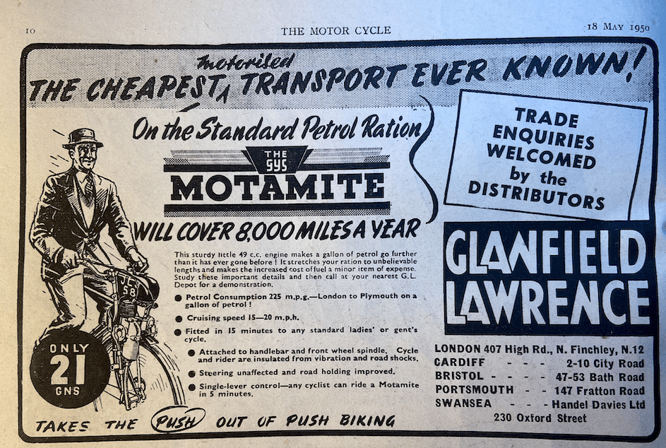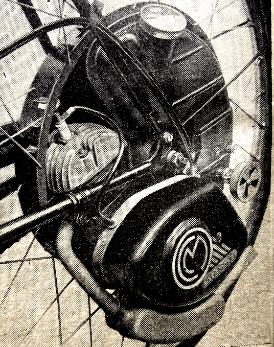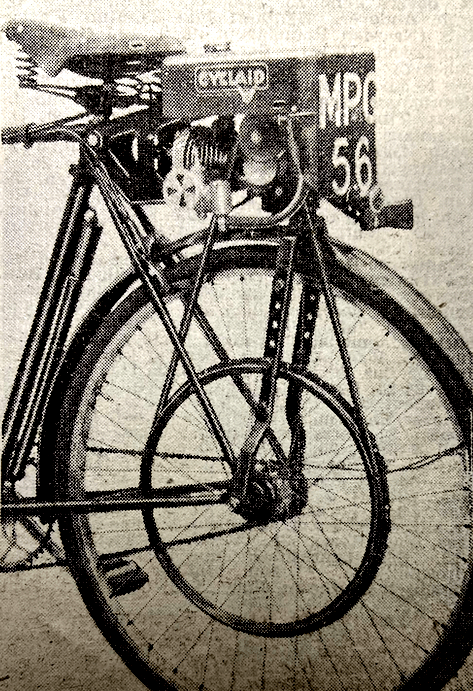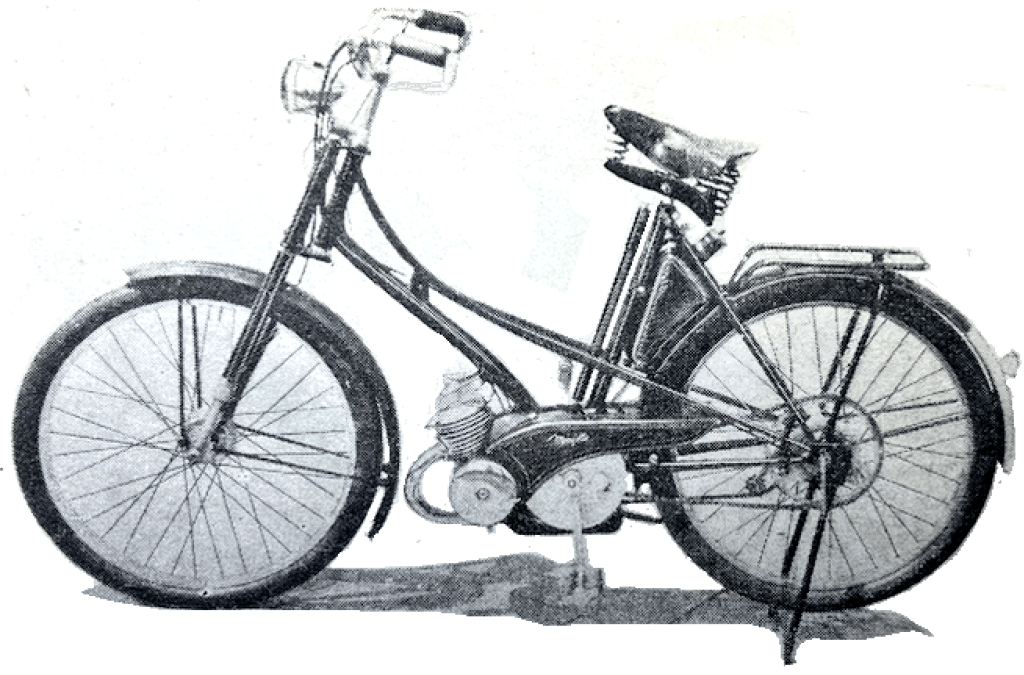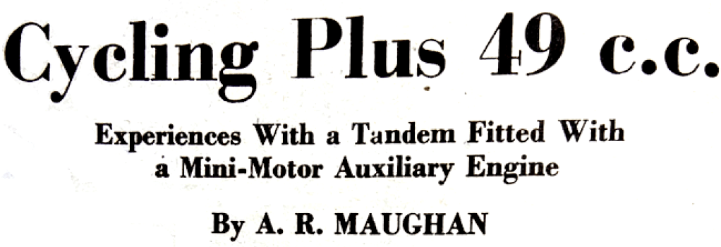“LAST AUGUST I FITTED a 50cc engine to an old, but sound, lightweight bicycle frame that had seen many years road racing before becoming a hack machine. It had 15swg spokes and a coaster brake. The rear tyre was a new ‘War Grade’ 26×1.25in Tandem. We travelled by ship to Dieppe, and my wife, with about 20lb of luggage, proceeded to ride across France to Switzerland. Our son and I, on a racing tandem, endeavoured to keep pace. This was easily managed on the level, but gradients showed that 50cc are more than the equal of a fit man, and, on the long climb to La Cure at the Swiss border, and again over the Col de Pillon, we were left far behind while the missus with light pedal assistance (it had to be light, as only one lung is working properly) pottered merrily along to wait for us at the various summits. On the sweeping downgrades the engine was used as an additional brake. An enjoyable holiday was spent which would have been impossible without that 4hp assistance. The only mechanical incidents were a choked jet and the silencer knocked off. This did not seem to matter abroad, but I must confess to some uneasiness as we came into London late at night. Fortunately, however, there were no complications. Since then the machine has made several trips to the coast at averages of better than 20mph, and I now use it for visiting out-of-the-way country places in the course of my work, which ranges from Devon to Northumberland. On the longer journeys I go to the base by train, and so for I have only paid cycle rates for carriage. Tyre wear is not excessive, after over 2,000 there is still tread on the tyre and there have been no punctures yet. Sitting still, doing 22-25mph, is very boring; I would rather cycle at 18-20mph or motor cycle at 45-50mph…I am thinking of springing both wheels. For the utility rider, the 50cc engine would appear to be an inestimable boon. One great advantage is that in the rain one can wrap up and sit still. On a pedal-cycle, movement keeps the wet outer garments flapping back, exposing the legs in particular, and the physical effort means, as often as not, that one is as wet or wetter from perspiration as from the actual rain. Full motor cycle kit is necessary for comfort, but one feels self-conscious dressed like a man from Mars on 50cc. Hill-climbing is adequate, and 1 in 9 and even 1 in 8 ascents have been climbed with pedal assistance. Some form of gearing would more than outweigh the extra cost.