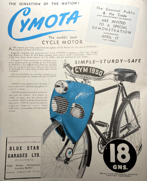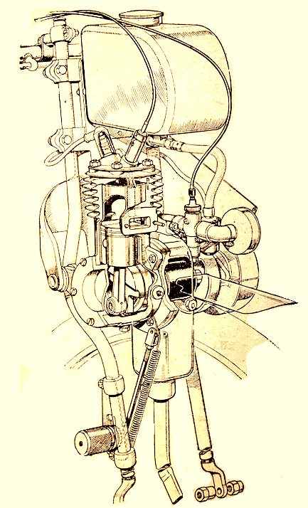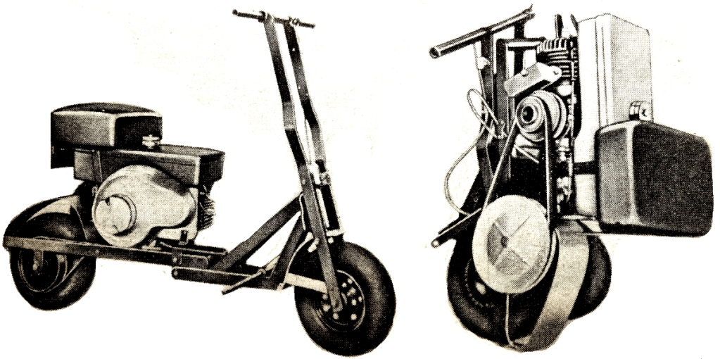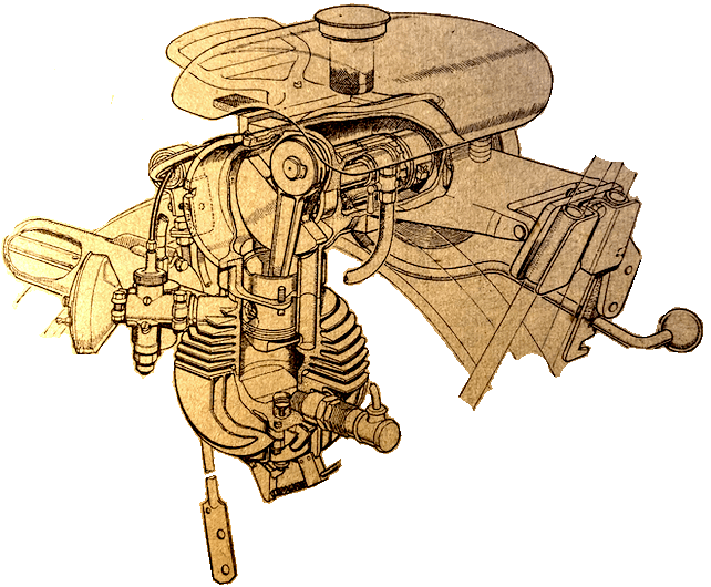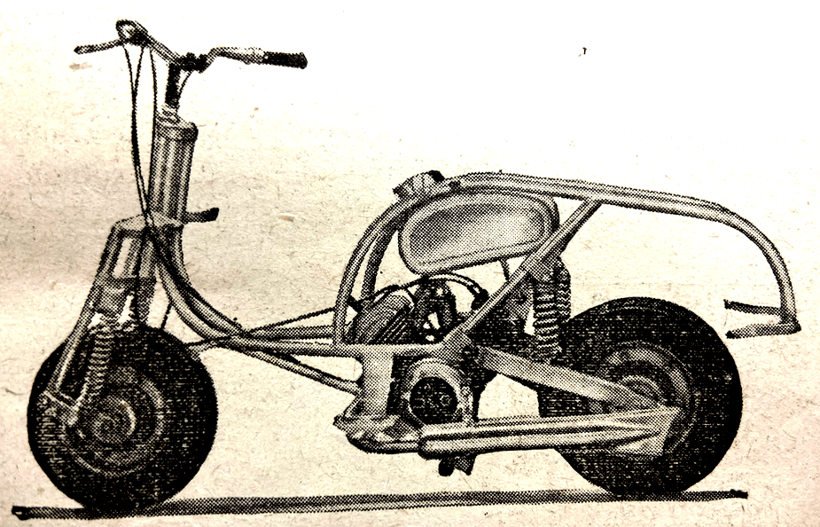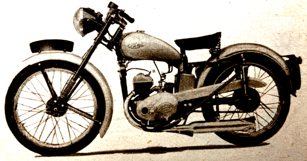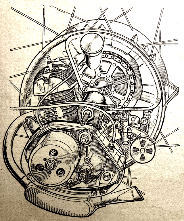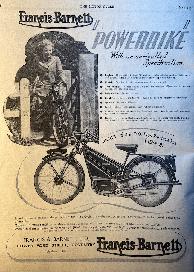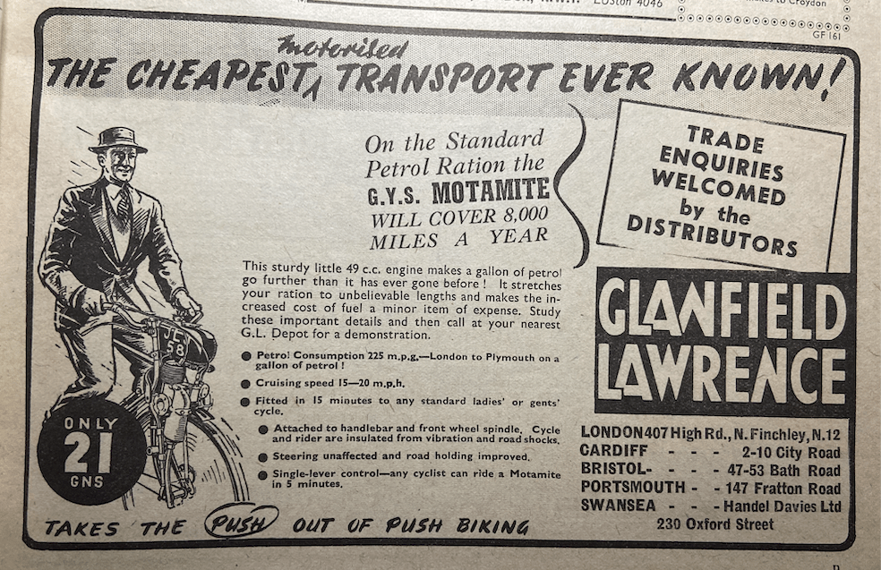 “LAST AUGUST I FITTED a 50cc engine to an old, but sound, lightweight bicycle frame that had seen many years road racing before becoming a hack machine. It had 15swg spokes and a coaster brake. The rear tyre was a new ‘War Grade’ 26×1.25in Tandem. We travelled by ship to Dieppe, and my wife, with about 20lb of luggage, proceeded to ride across France to Switzerland. Our son and I, on a racing tandem, endeavoured to keep pace. This was easily managed on the level, but gradients showed that 50cc are more than the equal of a fit man, and, on the long climb to La Cure at the Swiss border, and again over the Col de Pillon, we were left far behind while the missus with light pedal assistance (it had to be light, as only one lung is working properly) pottered merrily along to wait for us at the various summits. On the sweeping downgrades the engine was used as an additional brake. An enjoyable holiday was spent which would have been impossible without that 4hp assistance. The only mechanical incidents were a choked jet and the silencer knocked off. This did not seem to matter abroad, but I must confess to some uneasiness as we came into London late at night. Fortunately, however, there were no complications. Since then the machine has made several trips to the coast at averages of better than 20mph, and I now use it for visiting out-of-the-way country places in the course of my work, which ranges from Devon to Northumberland. On the longer journeys I go to the base by train, and so for I have only paid cycle rates for carriage. Tyre wear is not excessive, after over 2,000 there is still tread on the tyre and there have been no punctures yet. Sitting still, doing 22-25mph, is very boring; I would rather cycle at 18-20mph or motor cycle at 45-50mph…I am thinking of springing both wheels. For the utility rider, the 50cc engine would appear to be an inestimable boon. One great advantage is that in the rain one can wrap up and sit still. On a pedal-cycle, movement keeps the wet outer garments flapping back, exposing the legs in particular, and the physical effort means, as often as not, that one is as wet or wetter from perspiration as from the actual rain. Full motor cycle kit is necessary for comfort, but one feels self-conscious dressed like a man from Mars on 50cc. Hill-climbing is adequate, and 1 in 9 and even 1 in 8 ascents have been climbed with pedal assistance. Some form of gearing would more than outweigh the extra cost.