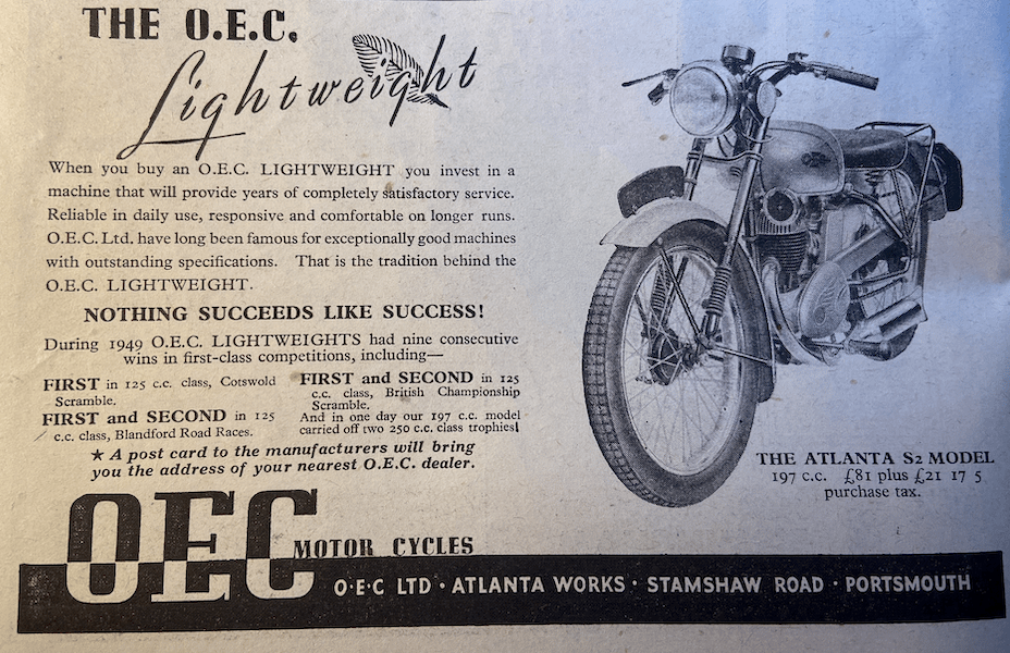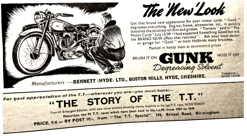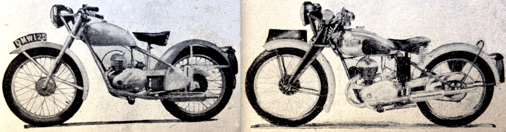 “IT IS NOTICEABLE that in all two-stroke engines (excepting the Scott) the method of lubrication is the same: ‘Petroil’. Now, it seems to me a pity that the ‘old-fashioned’ method of separate oil and petrol has been done away with. No doubt cost is the main factor involved, but I think two-stroke enthusiasts would welcome the return of separate lubrication for one reason alone—easy starting. My first two-stroke—a Sun Vitesse—had separate lubrication, and starting was easy. I think that this was due to the fact that the mixture was more easily fired. I cannot recollect having been let down with a dirty plug. So here’s hoping that some maker will produce a machine in the lightweight class with this benefit that favours the four-stroke.