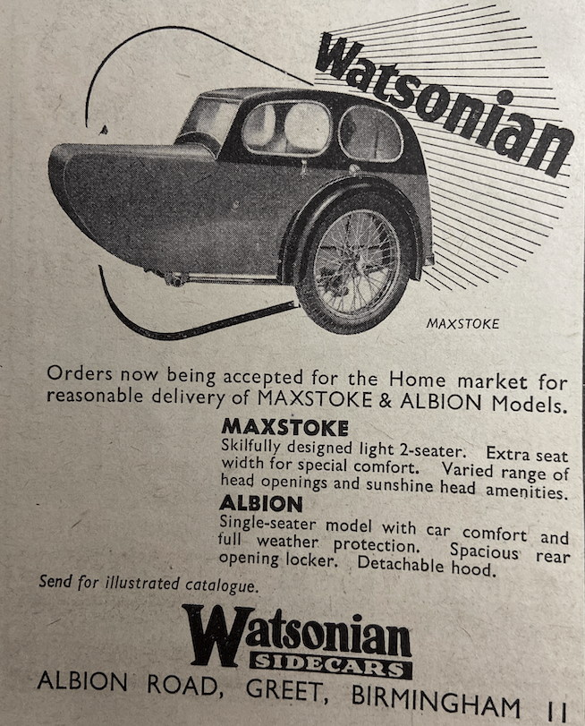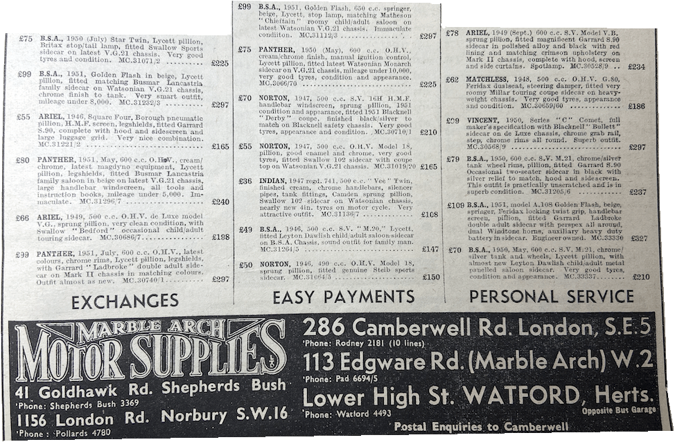diameter exhaust pipes; folding footrest assembly; revmeter and fittings; racing handlebar and lin fittings; a one-gallon oil-tank with pipes; petrol feeds; cables and junction box for the twin carburettors; gasket set; front racing number plate to fit the nacelle. Close-ratio gears, straight-through exhaust extensions, and engine sprockets are also available as extras and the owner is left to provide only racing tyres, chains and plugs to his personal taste. The appeal this racing kit will make to the sporting rider can well be imagined. To be able to obtain a racing machine for more than £100 below the price of the old Grand Prix and to be able to use the machine on the road as well is a welcome innovation. The T100 engine has undergone several changes. The cylinder and head are now die-cast in light alloy, and the fins are of closer pitch than before. Valve-seats of Meehanite cast-iron are cast in the light-alloy head. Push-rods are now of Duralumin to keep pace in expansion with the light-alloy cylinder-head and block. There is very little ferrous metal in the new Tiger 100 engine, which is also used with a lower compression ratio in the Trophy model.” As well as reviewing innovations to motor cycles on the British market (the foregoing excerpt concentrates on some of the lesser known marques) the Blue ‘Un described the auxiliary engines and sidecars destined for the 1951 season. So, for the record, here are the sidecar manufacturers: Blacknell, Bowser, Busmar, Garrard, Leyton, Swallow, VP and Watsonian; and the clip-on motors: Bantamoto, Bikotor, Cucciolo, Cyclaid, Cyclemaster, Cymota, GYS Motamite, Mini-Motor, Power Pak and VAP.