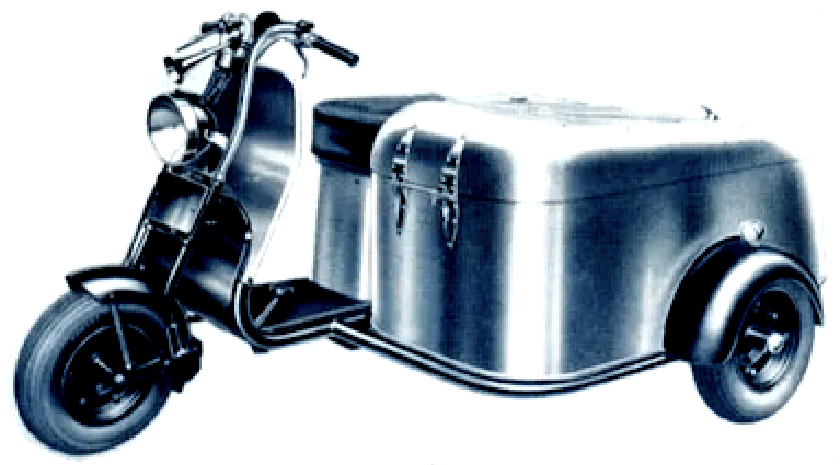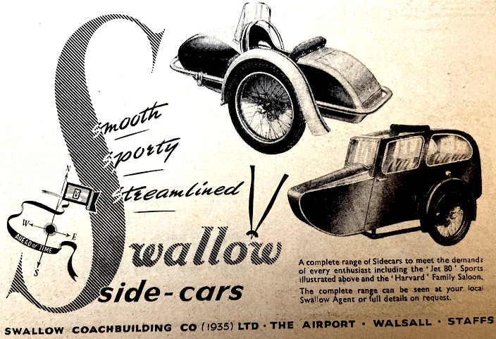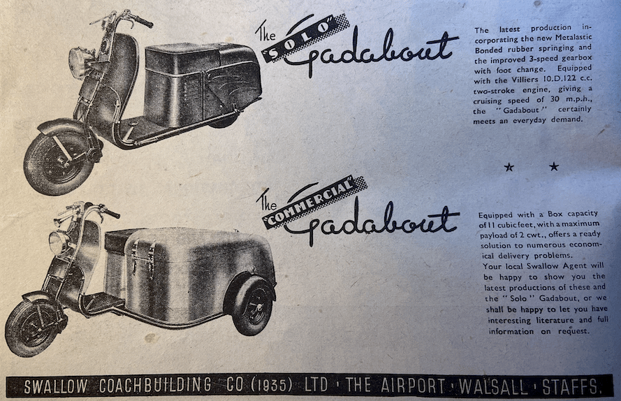 FOR 1951 THE SWALLOW GADABOUT will once again be available in solo and commercial three-wheeler forms, but the commercial model, now to be called the ‘Major’, will be fitted with a 197cc Villiers engine in place of the 122cc engine employed in the past. Cooling of the commercial model has been improved by the adoption of a four-blade fan which replaces the two-blade type used previously. Also designed to assist cooling of the commercial model, the track has been widened by an inch to allow a greater airflow between the carrier body and the engine housing. Other changes to the Major include the use of 531 tubing for the fork and higher-grade tubing for the chassis; the replacement of the rear brake operating cable by a rod; a rather more rounded front weather shield; the provision of 10 louvres in the engine housing; an improved silencer; better engine accessibility; and the fitting of a cover to facilitate topping up of the primary chain case. The ‘van’ component of the Major has a capacity of eleven cubic feet and a payload of 2cwt. Tare weight is 300lb; overall width is 4ft 4in. Cruising speed is 35mph with a maximum speed of 42mph. Lighting is by battery, rectifier and a Lucas 6in head lamp. No change is to be made to the Mk 2 Solo Gadabout which has a 122cc Villiers engine. Weight is 2141b; ground clearance is 4in; tyre sizes are 4.00x8in; seat height is 27½in.”