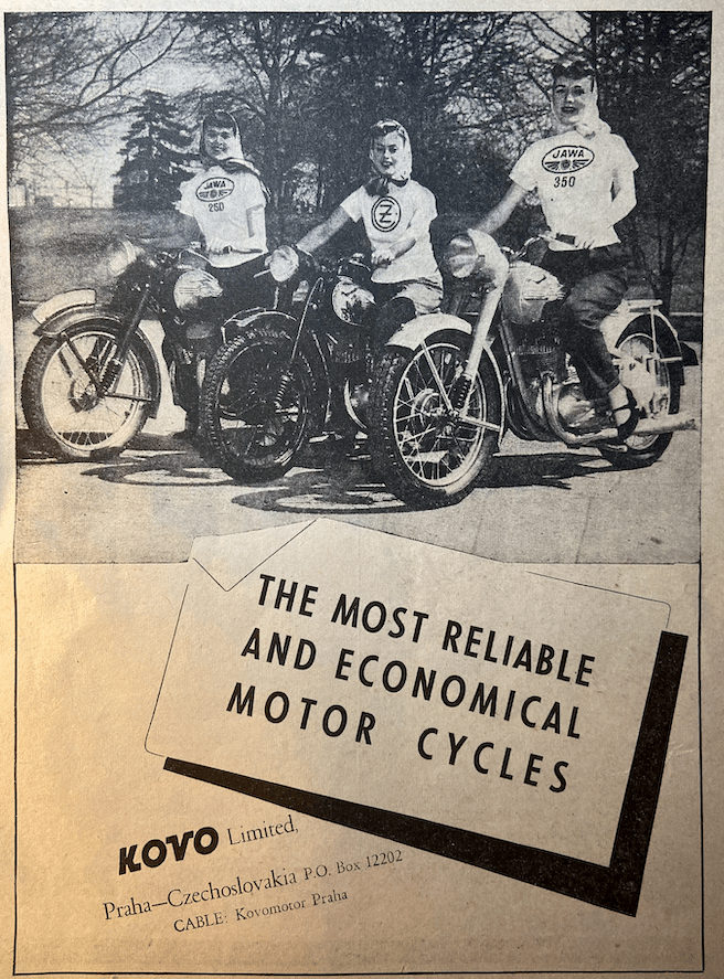 “I SHOULD LIKE to reply to two of your recent correspondents, PG Heron and T Saunders. First to deal with Mr Saunders. Surely it must occur even to him that those of us who elect to ride bikes are not exactly helpless, fluttery females, and we certainly don’t think it is our ‘rightful’ place to take the back seat! As for road sense, and driving in traffic…well, Mr Saunders, we all have to pass the same driving test—at least I haven’t heard of a ‘Ladies Only’ driving test. As for his little piece about ‘temperamentally they are definitely not suited to ride motor cycles’,—just what he means by that, is, I am afraid, lost on me—unless of course, it is male pride trying to assert male superiority. Mr. Saunders, I have one suggestion to make—seeing that women are joining the game, sell your bike (if you have one) and take up knitting; then you won’t have to worry anymore about this horrifying business. The second letter was in reply to Marie Krejcar, and I must say that my sympathies lie with her. The ACU restrictions do seem very unfair when you consider that every other form of racing is open to women, eg, in cars, sand racing, etc. These ancient prejudices were drowned during the war—nobody said that we shouldn’t work in munitions factories, fire the guns, etc, etc, but when some girl or other wants to take advantage of the so-called freedom which we are supposed to have won well, a lot of Victorian ideas and ideals keep her out. I ask you, is it fair? After all, what’s the use of saying, ‘you can go in for trials’, if the yearning is for racing? It is like saying to a fisherman ‘well, you can’t fish, but you can go in for dancing!’ I hope that Marie Krejcar and the others like her will keep on trying. Then one day they may get their wish. Anyway, lots of luck.