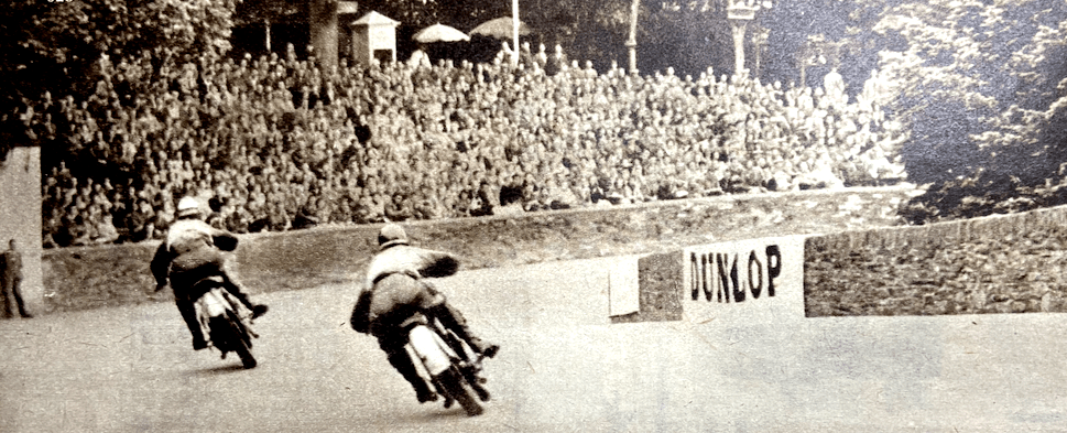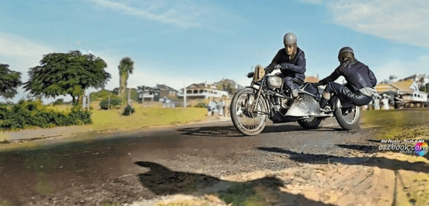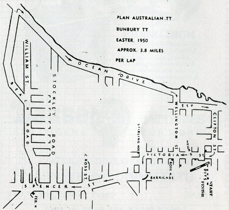 “I REMEMBER (BY AUB MELROSE). I remember the motor cycle club of West Australia’s first road race of 1915 when 28 starters, solo and side-car, rode like mad around a 150 mile Tourist Trophy course consisting of deep gravel, pot holes, cart tracks and sand tracks through the scrub and forest of our hills area. When that great pioneer Charlie Lewis gained fastest time at 45mph average and Len Perry, a school master, riding a Rudge Multi won the solo handicap and Bill Franz with his fiancee in the chair, won the sidecar class. Yes! 1915! and those boys rode hard with sidevalve engines and belt drive and also vee-block brake equipment and almost pushbike size tyre equipment of 26×2.5 inches. I remember, as a boy, watching perhaps the greatest pioneer of them all, the late PW Armstrong, preparing to start as scratch man in Northam to Perth Tourist Trophy in 1918. I gazed in awe at his huge 8-valve Indian and was nearly deafened when he took off, as his enormous Indian was the loudest motorcycle I have ever heard. The giants and pioneers of the 1915-1920 era of motor cycle road racing frame, too numerous to mention, but never forgotten, were all my boyhood heroes, on the bush tracks and also the salt lakes of Perkalili and the grass tracks of Clarmont, Subiaco, Leederville and Lotons Park, on motor cycles long since forgotten by most but still remembered by few. They laid a solid foundation for Western Australian motor cycling as we know it in this state today and were famous for the daring and skill which today is inherited by the youth of the 1950 Bunbury Tourist Trophy races. I started my motor cycling in 1916 and as a competition rider with the coastal club in 1923. The 1920- 1930 years have been remembered as the Golden Age of motor cycling. It was confined as a sport to grass track racing, road record breaking (until the Commonwealth Government brought in an act of Parliament to prevent it in 1927), reliability trials, hill climbs, and later cinder track broadsiding and scrambles were in the vogue…Roy Charman became the first Westralian to journey to England to try his luck over on the Isle of Man in the world famous TT races in 1926 He crashes badly in the practice and broke his rist riding the now extinct Wallis-JAP 350 but rode well to earn for West Australian its first International Six Days Gold Metal (three only have been won by Australians, I believe) Len Stewart followed me when I joined my friend Charman in England, Stewart to ride for Nortons and myself for Sunbeam in the TT. Len Stewart, our really marvellous West Australian all-rounder, was forced out of the second lap of the Senior with a smashed rear wheel when showing extraordinary promise. Shortly afterwards he broke his leg badly at Brooklands. I was lucky enough to finish at all after two lurid crashes at high speed in the sixth lap, to become the first Australian ever to finish the TT. I remember Len and I were warned by the ACU officials for our unorthodox riding on the practice. One morning at the 33rd Len fell on the mountain, wrote the model off and lost his pants, and another time we ran through a flock of fowls and Len’s Norton had a deposit of broken eggs aboard…on account of a bruised base of the spine incurred in a previous crash, George Dance, a famous TT rider, fitted a leather encased piece of sorbo rubber on the rear mudguard of my TT Sunbeam. I found it most comfortable and proceeded to do all my riding sitting on the mudguard. I managed to get a couple of laps in on this particular morning of practice before I was grounded by the marshalls for dangerous procedure. After demonstrating how easy it was to ride this way, I was allowed to use this method on the pain of being disqualified if the machine looked out of control. It may be claimed that this incident started the universal riding style now adapted all over the world and as you are witnessing it today in the Australian Tourist Trophy races for 1950 at Bunbury. (Mr Melrose refers to the Pad which permits the rider to adopt what is now known as the racing crouch. He later informed me the reason for the rear Pad was not for comfort but so as the face would be behind the engine when it blew up thus throwing the metal round the countenance of the rider.)…It was not until 1934 that West Australia saw its first road race in real Isle of Man fashion. This was in September at the North Beach 2.2 miles circuit and 20 laps for the race. This pioneer event run by the WAMCA was so successful and exciting that it became the start of a long succession of splendid road race events which have been so efficiently and safely conducted in the leading towns of our State throughout the years.”