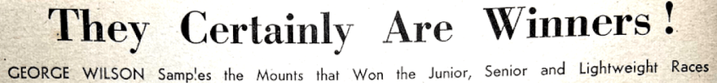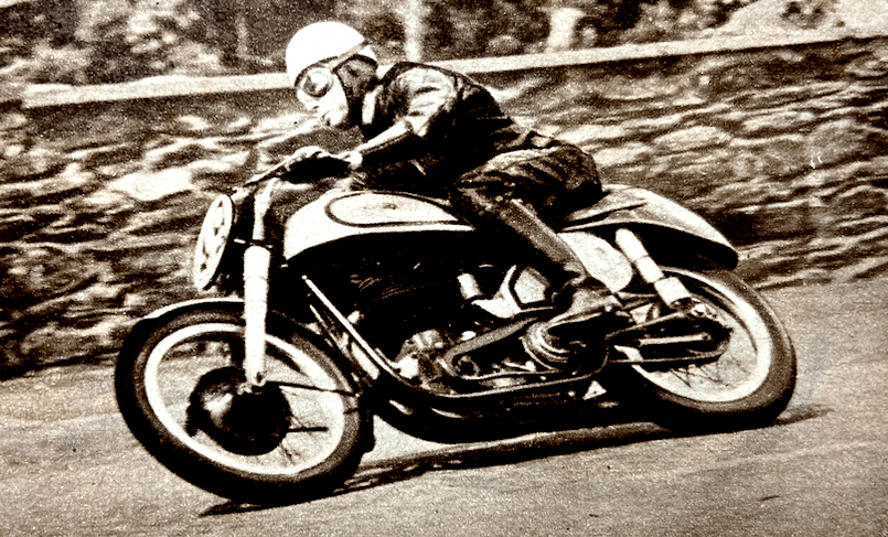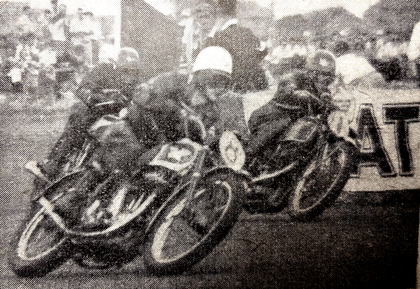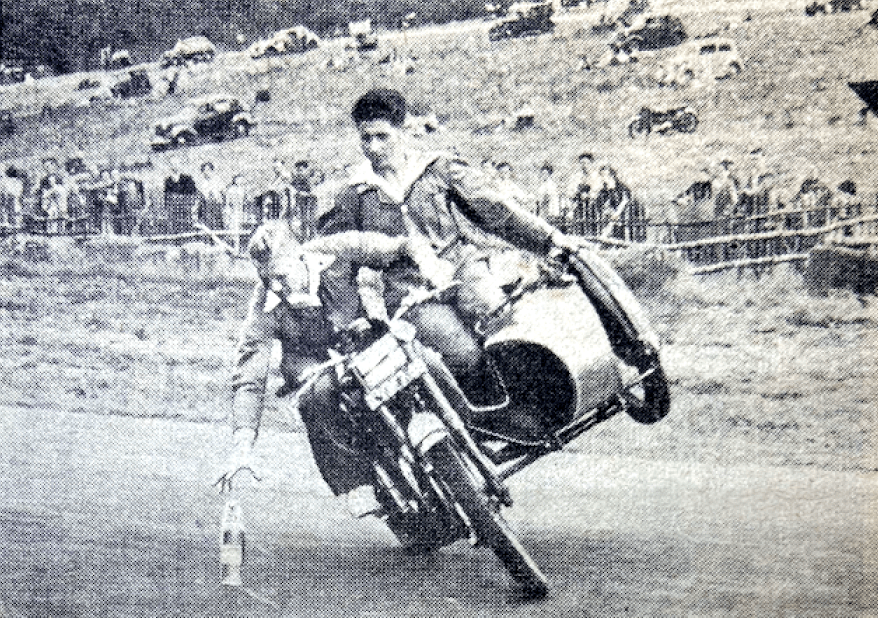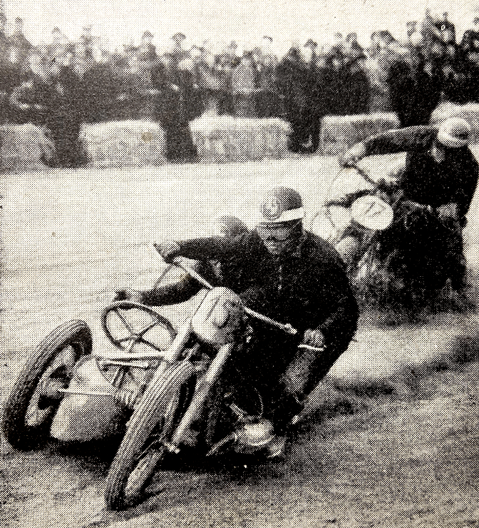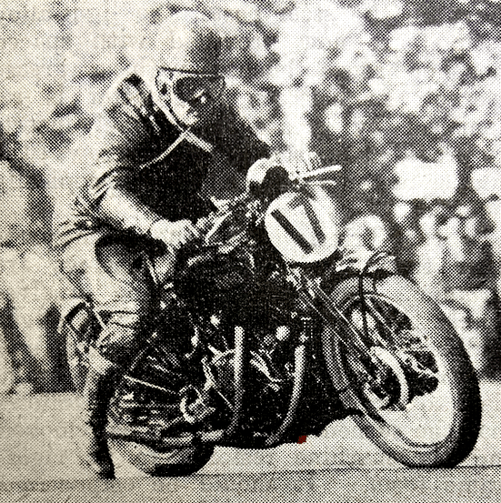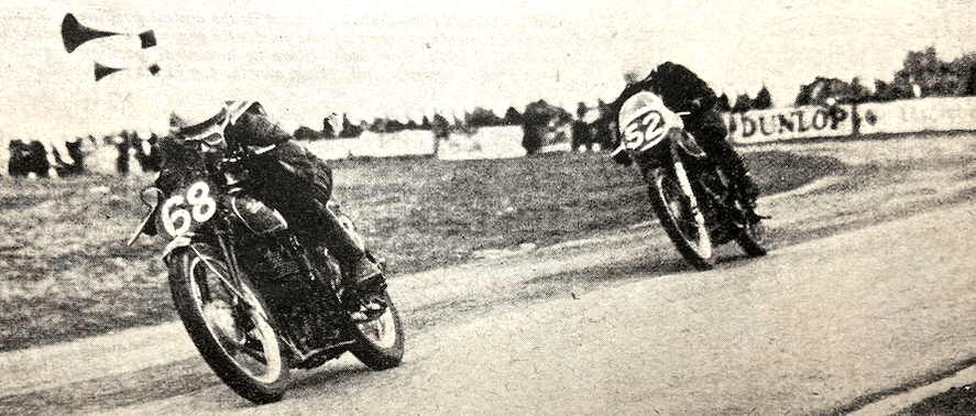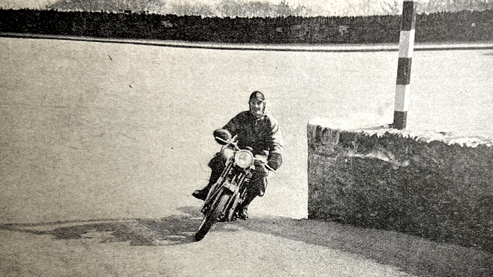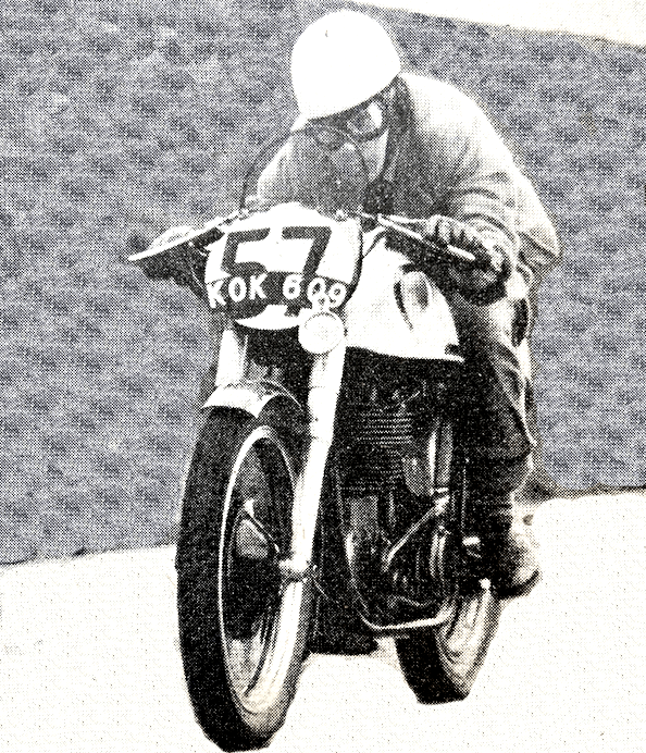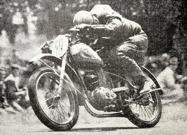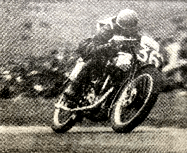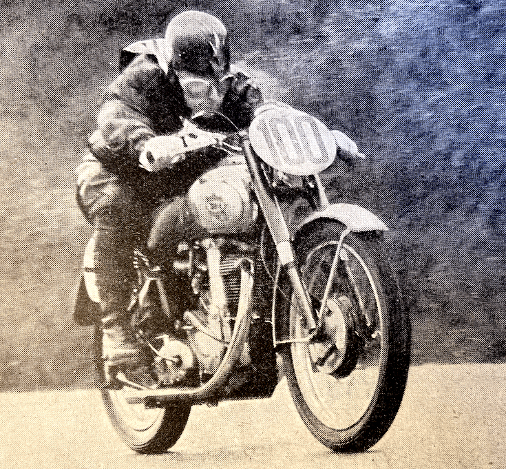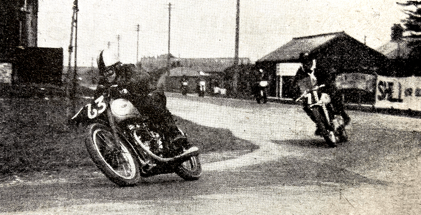 “BAD WEATHER DELAYED the start of the Patea (New Zealand) TT races, and almost continuous rain fell during the Senior and Handicap races. RW Coleman (AJS) led from start to finish in the 40-mile, four-lap Junior event, and LV Perry (Velocette), laying second, was always well ahead of the rest of the field. In the Handicap race, B Field (347 Matchless) and AG Bain (348 BSA) led for most of the first lap. Triumph rider JA George threaded his way through the field, however, and during the last of the three laps he took the lead and held it to the finish. R Milne (498 Triumph) followed George to take second place.”