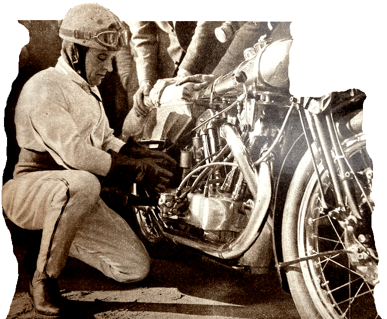 “THE ITALIAN, LUIGI CAVANNA, driving a 248cc supercharged, single-cylinder Moto-Guzzi with sidecar, broke (subject to confirmation) no fewer than 20 world’s records on the Munich-Ingolstadt highway in Germany. Cavanna captured not only the eight standing-start and flying-start records up to 10 miles in the 350cc classes, but he also broke the existing records in the 500, 750 and 1,200cc classes for 5km and five miles flying start and 10 miles standing start. The engine has a supercharger of the pump type.” Speeds ranged from 73mph (standing start, 1km) to 137.5mph (flying start, 1km). “Cavanna’s speeds for the flying kilometre and flying mile are higher than the 250cc solo records…his speeds for the 5km and five miles beat the existing 250cc and 350cc solo records.”