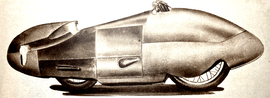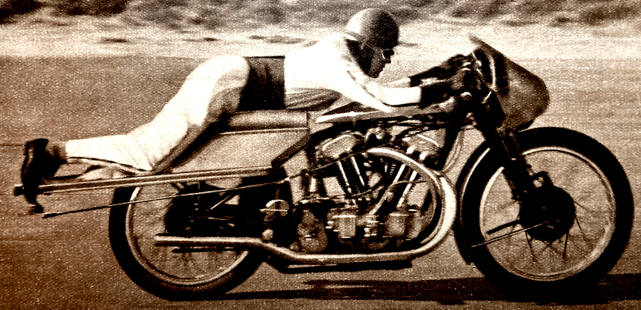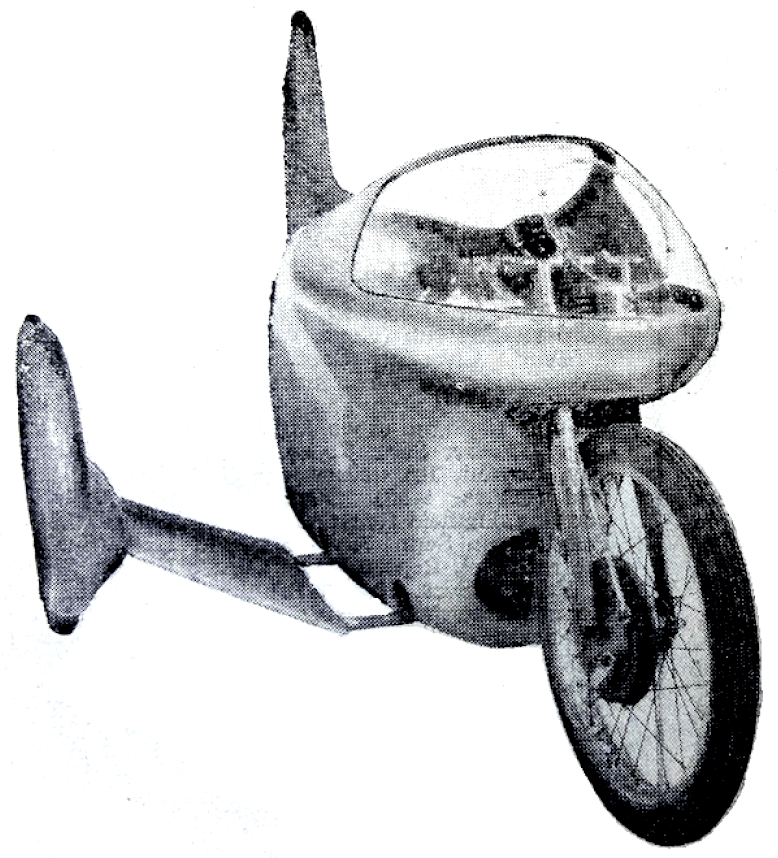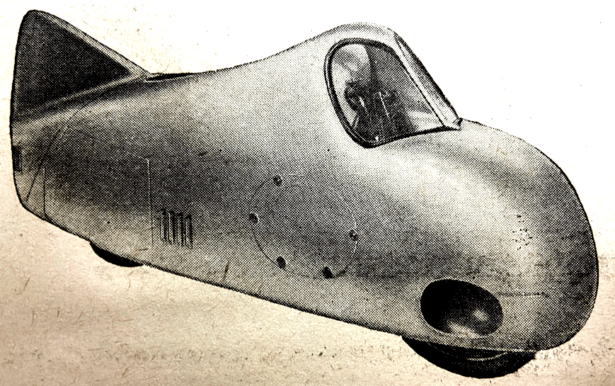 figures to sort out, I prefer to take my shell down to Pendine and to do a few trips along the seven miles of sand, first at 100mph and gradually faster on each run until at the end of, say, ten or a dozen runs it is apparent that the model performs either dead right or not. If it won’t, then it is better to find out before going to the autobahnen and perhaps meeting with a sticky finish. Also, because in this country of ours there is nowhere to try the machine except at Pendine, let me say that it is the ideal spot for a testing ground when the sands are right. These high speeds are not far a casual enthusiast with a hot motor. I have been studying the problem for 12 years. This past year I put a lot of my theories to the test in a practical manner and, although the record still eludes me, I have gathered so much useful data that I am confident of eventual success. The vastness of Pendine Sands is most deceptive. One has no conception of the speed at which one is travelling even when the rev-counter needle is way up the clock; but when doing the same revs on an autobahn the sensation is heart-stopping. The road genuinely assumes the appearance of a tape, and when there are bridges across it, as at Jabbeke, then it becomes definitely full of fun—you instinctively duck your head as you shoot through them! JAPs, the finest big-twin manufacturers in the world, have produced a new series of big-twins. This engine could take the record almost as it stands sans blower; with a blower it should be capable of exceeding 200mph, which I regard as the next step after the record is broken. To achieve this with a production type of engine, as distinct from a specially conceived layout built for the job, would be an achievement of which the trade could justly be proud, even though of 1,000cc capacity. After all, in the car racing world an unblown engine of 4,500cc is allowed to compete on equal terms with a blown 1,500cc job; a difference in size of 3,000cc is reckoned to equal the advantage of a supercharger. However, should we break the record with the big engine, I still think that as a matter of British supremacy we ought to try to beat the BMW with a British 500. The obvious choice, of course, is a 500 twin. We have TT twins which on pool fuel must be developing 55bhp; so, if we take the 78bhp of the BMW as a datum line, what are the possibilities? A Shorrocks supercharger blowing at about 24lb pressure an engine running on alcohol fuel should put the power above the 80 mark; and with streamlining round a prone rider we should get a frontal area of fantastically small proportions. The prone position is a must. It gives excellent control, perfect visibility, no cramp of the neck muscles, and permits the shell to be kept low and narrow.”