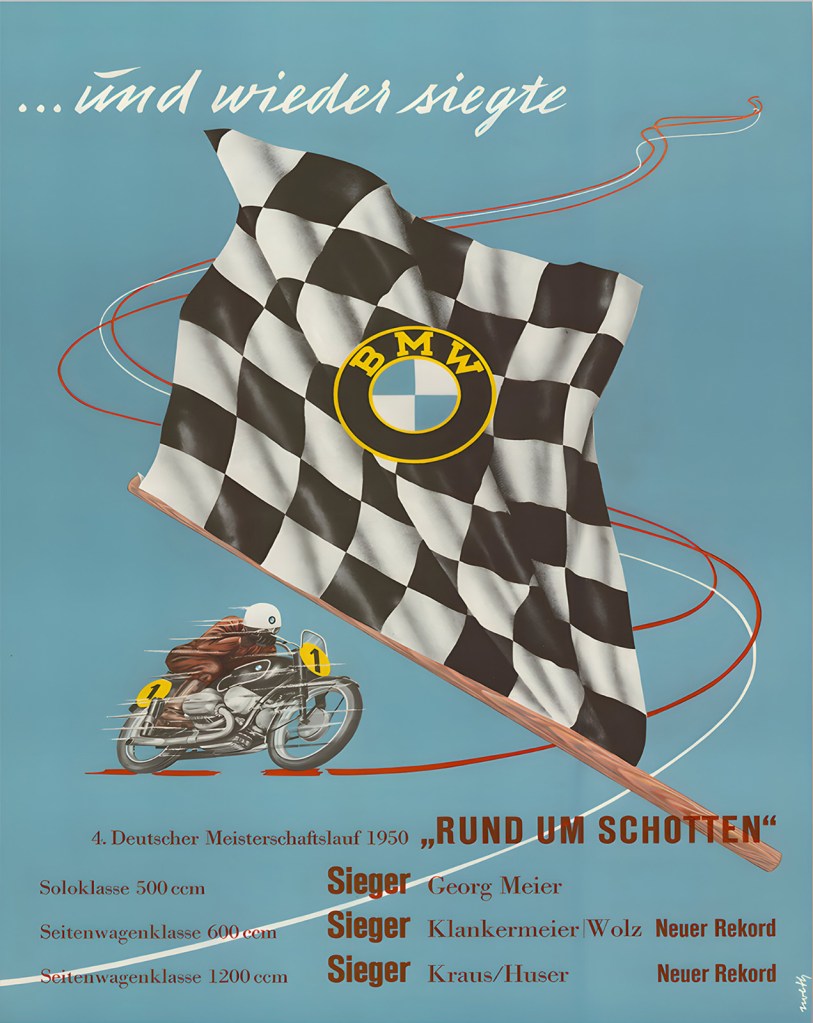 “WORKS PHOTOGRAPHS OF the new BMW racing machines have at last been released. Three of the new models, ridden by G Meier, W Zeller and G. Baltisberger, who finished first, second and third respectively, were at a meeting at Hamburg on August 25. Meier’s speed was 130.6kph, which compares with his 1950 winning speed of 130.9kph on the same circuit when he rode one of the earlier supercharged models. Zeller’s speed at Hamburg was 130.5kph, and Baltisberger’s 129kph (130kph is equal to 80.63mph). These figures appear to indicate that remarkable progress has been made with the atmospheric-induction engines—and also, presumably, with the new frames, which are said to provide good, though not yet exceptional, handling.”