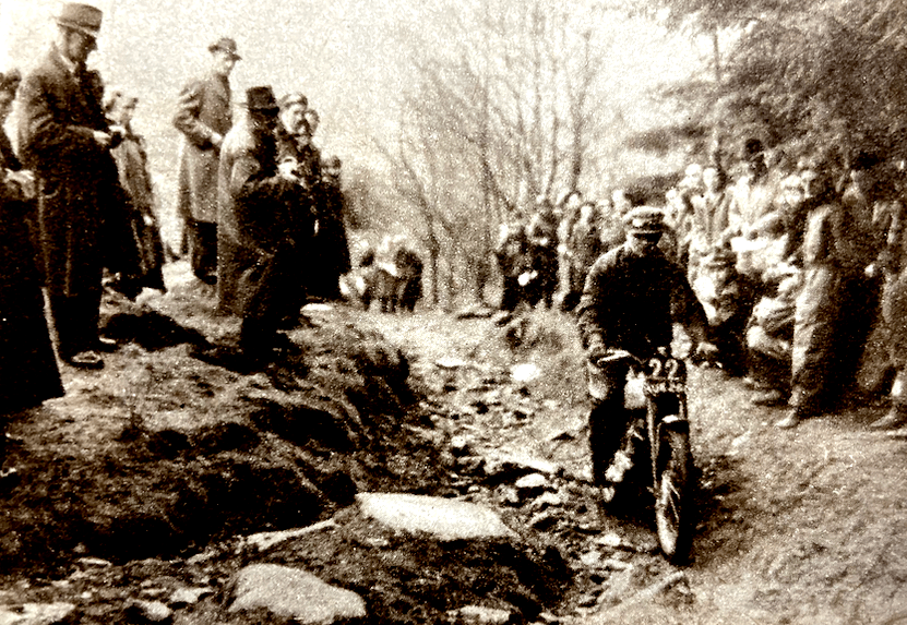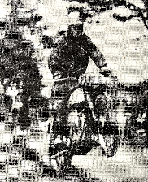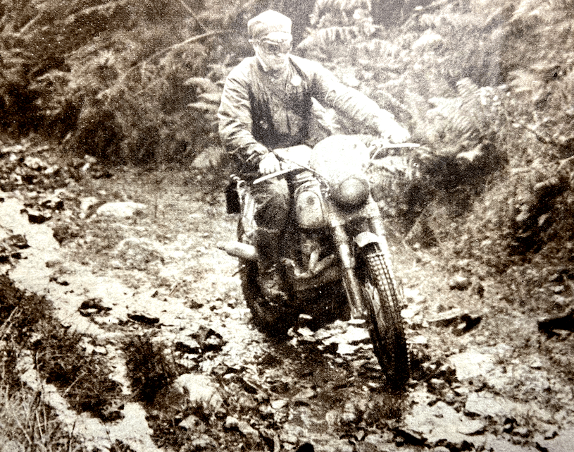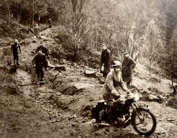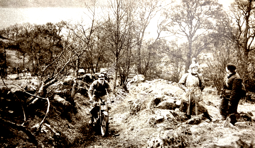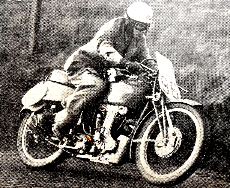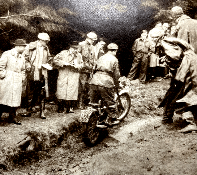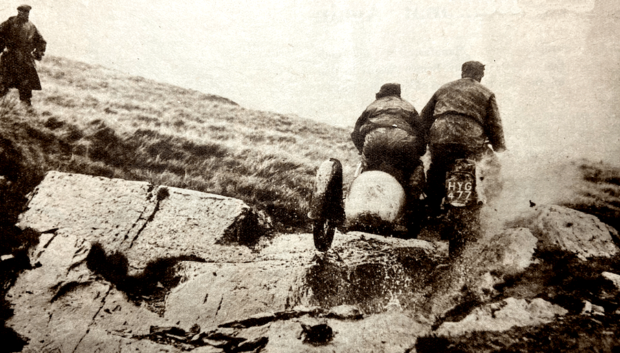 obstacle of the ‘Scottish’. This ultra-long steep hill, with its many corners and rock-and-boulder surface, can always be reckoned to take a big toll of marks…Many a competitor had his confidence shattered before he reached the loftier sub-sections. None of the lightweights was able to conquer the hill. The bigger machines seemed a good deal steadier, aside from their advantage of plenty of power, and among the first 20 of the ‘heavies’, seven clean climbs of the more difficult sub-sections that could be seen from one vantage point were noted; among them, AHL Archer (497 Ariel) and NS Holmes (346 Royal Enfield) were outstandingly good. Geoff Duke was unlucky in the second sub-section, which included the notorious Flook’s Corner. He negotiated the bend and then his Norton strayed over to the right; the edge of the track got nearer and nearer till the rear wheel slid over the edge and Duke was as near as nothing on his way to tumbling down the hill…But by far the best climbing feat was by the irrepressible W Nicholson (499 BSA), who, though his model slithered over to the brink on the right, remained as calm as ice and rode up with never a suggestion of nervousness. Quietest and most gentlemanly performance seen was by NJ Jarrett, riding one of the special 498cc side-valve military-type Triumph Twins…Last lap came with Mamore Road leading from the heights of the hill into Fort William. In its 11 miles, Mamore Road gives a variety of sporting going, including rock, cross-gullies, shallow watersplashes, mud and ruts. It is a sportsman’s paradise and was a fitting conclusion to the 180-mile opening day of the trial. Sidecars especially had a tough day, and none did any complete section clean except for FH Whittle (598 Panther sc), who managed the full length of Stoney Brae without penalisation. At midnight results were available. These showed that only L. A. Ratcliffe (347 Matchless) had retained a clean sheet. Runners-up with three marks lost (one foot) were BHM Viney (347 AJS), NS Holmes (346 Royal Enfield), D Tye (348 Douglas), and AHL Archer (497 Ariel)…Leading sidecar was Whittle (598 Panther sc), with 58 marks lost…Of the under-200cc class, the leaders were EW Smith (197 DMW) and C Kohlicek (150 CZ), with 20 marks lost. Leading manufacturer’s team, with a total of 19 marks lost, was Matchless (LA Ratcliffe, E Usher and DJ Ratcliffe).” So much for Day 1—the eventual winner was Artie Ratcliffe, who lost 12 marks. The sidecar class was won by Harold Tozer on a 499cc Beeza, who lost 36 marks.