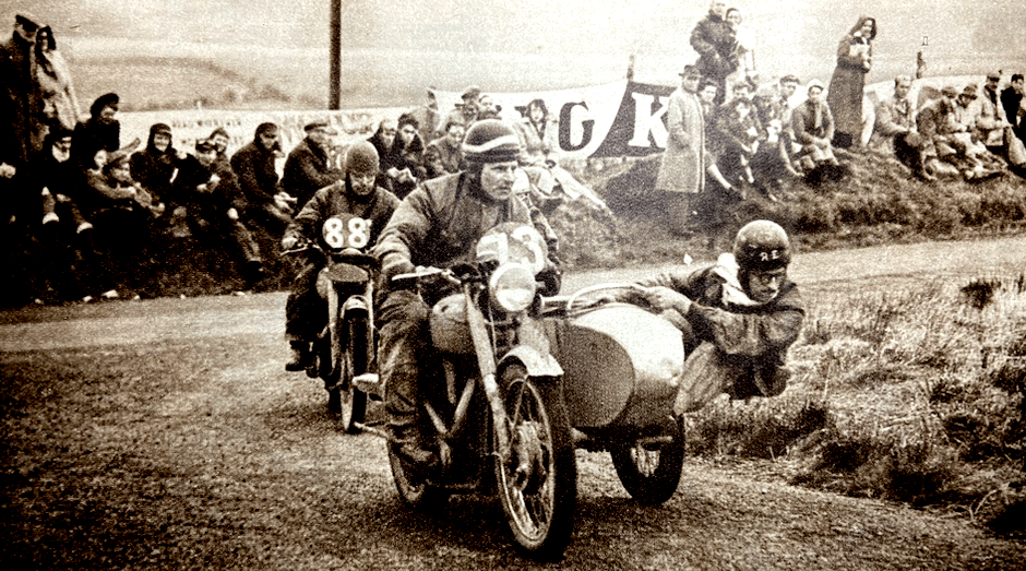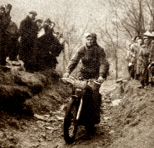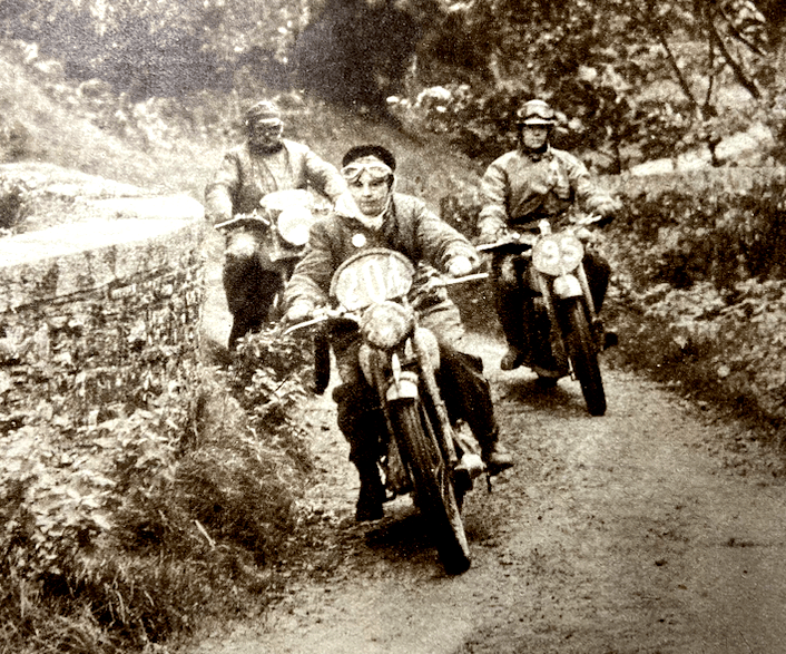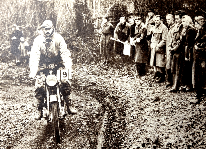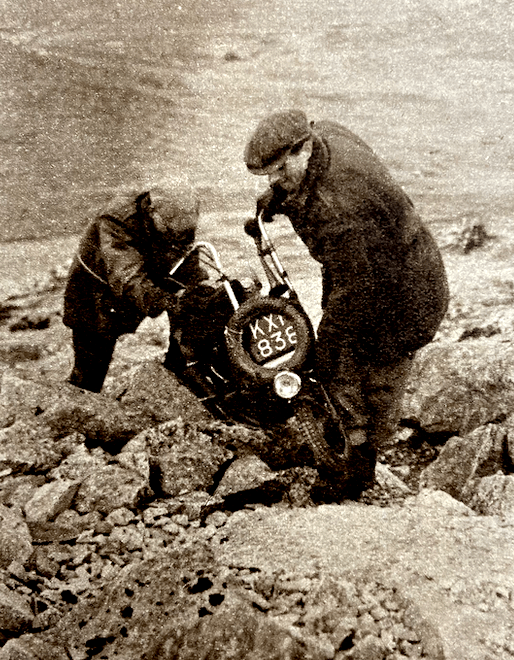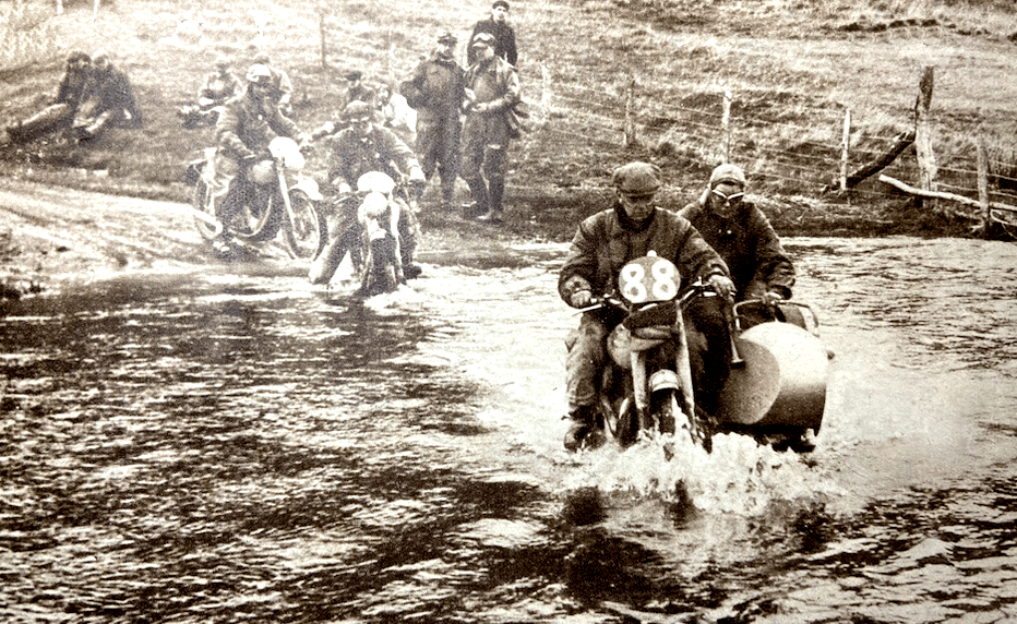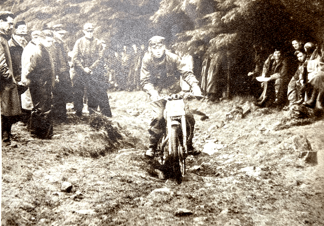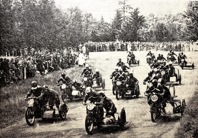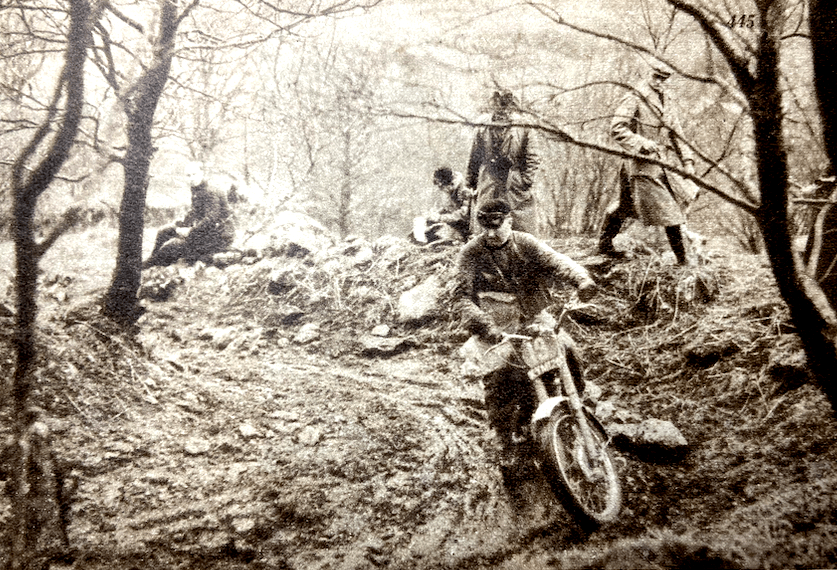obstacle of the ‘Scottish’. This ultra-long steep hill, with its many corners and rock-and-boulder surface, can always be reckoned to take a big toll of marks…Many a competitor had his confidence shattered before he reached the loftier sub-sections. None of the lightweights was able to conquer the hill. The bigger machines seemed a good deal steadier, aside from their advantage of plenty of power, and among the first 20 of the ‘heavies’, seven clean climbs of the more difficult sub-sections that could be seen from one vantage point were noted; among them, AHL Archer (497 Ariel) and NS Holmes (346 Royal Enfield) were outstandingly good. Geoff Duke was unlucky in the second sub-section, which included the notorious Flook’s Corner. He negotiated the bend and then his Norton strayed over to the right; the edge of the track got nearer and nearer till the rear wheel slid over the edge and Duke was as near as nothing on his way to tumbling down the hill…But by far the best climbing feat was by the irrepressible W Nicholson (499 BSA), who, though his model slithered over to the brink on the right, remained as calm as ice and rode up with never a suggestion of nervousness. Quietest and most gentlemanly performance seen was by NJ Jarrett, riding one of the special 498cc side-valve military-type Triumph Twins…Last lap came with Mamore Road leading from the heights of the hill into Fort William. In its 11 miles, Mamore Road gives a variety of sporting going, including rock, cross-gullies, shallow watersplashes, mud and ruts. It is a sportsman’s paradise and was a fitting conclusion to the 180-mile opening day of the trial. Sidecars especially had a tough day, and none did any complete section clean except for FH Whittle (598 Panther sc), who managed the full length of Stoney Brae without penalisation. At midnight results were available. These showed that only L. A. Ratcliffe (347 Matchless) had retained a clean sheet. Runners-up with three marks lost (one foot) were BHM Viney (347 AJS), NS Holmes (346 Royal Enfield), D Tye (348 Douglas), and AHL Archer (497 Ariel)…Leading sidecar was Whittle (598 Panther sc), with 58 marks lost…Of the under-200cc class, the leaders were EW Smith (197 DMW) and C Kohlicek (150 CZ), with 20 marks lost. Leading manufacturer’s team, with a total of 19 marks lost, was Matchless (LA Ratcliffe, E Usher and DJ Ratcliffe).” So much for Day 1—the eventual winner was Artie Ratcliffe, who lost 12 marks. The sidecar class was won by Harold Tozer on a 499cc Beeza, who lost 36 marks.