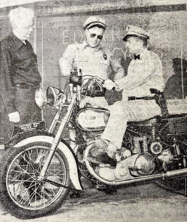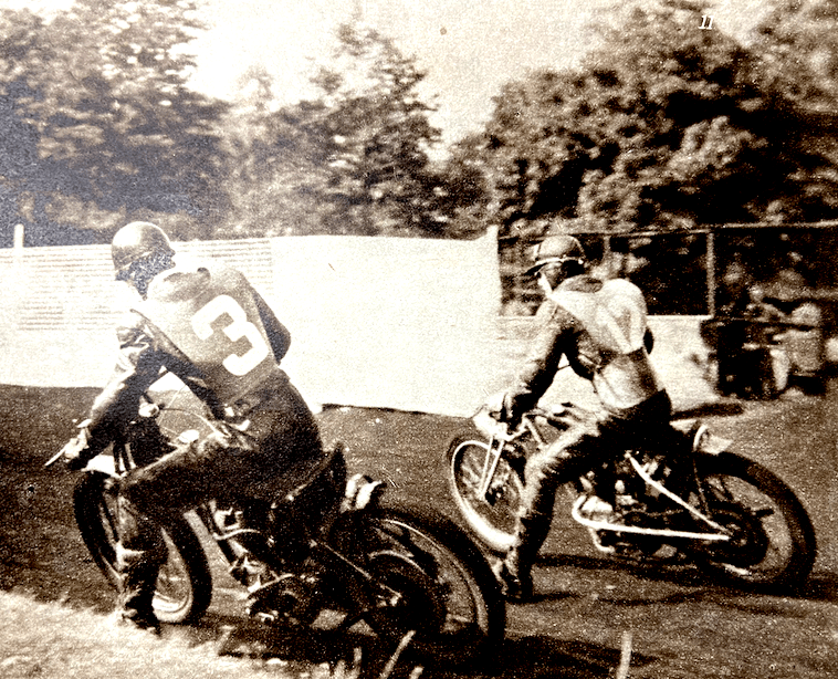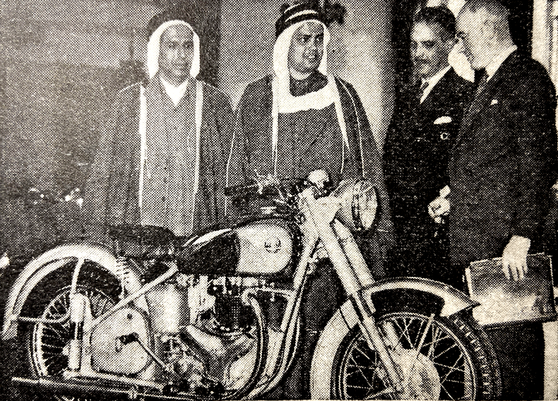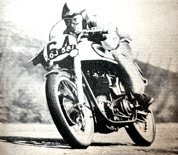 “THE NEWLY FORMED Calcutta Motor Sports Club has acquired a racing circuit at Kancharapara airfield, some 40 miles from Calcutta, and two meetings have been held there. Artificial bends and corners were introduced to keep down speeds, as most of the riders were new to racing. In the 500cc event at the first meeting, A D’Abreu (Ariel Twin) was the winner with a speed of 43mph. The second event was a ½-mile ‘dice’, with Harley-Davidsons competing against the 500s. On the first run, Bishop (Triumph Speed Twin) was winner, and on the second D’Abreu again won. The second meeting took place over a 2.2-mile circuit, in a temperature of 110°. Seven machines started, and Gordon, mounted on a Triumph Tiger 100, immediately took the lead, with D’Abreu (Ariel Twin) slipstreaming him. On Lap 2 the Ariel retired with a seized engine, and Wilks (Triumph Speed Twin) filled second place. Gordon’a fastest lap was at 60mph.”