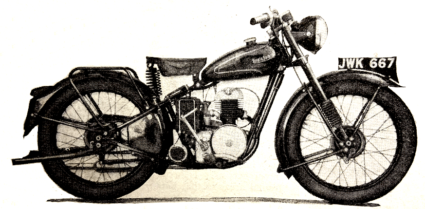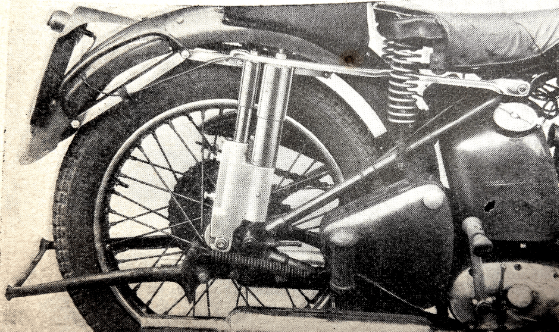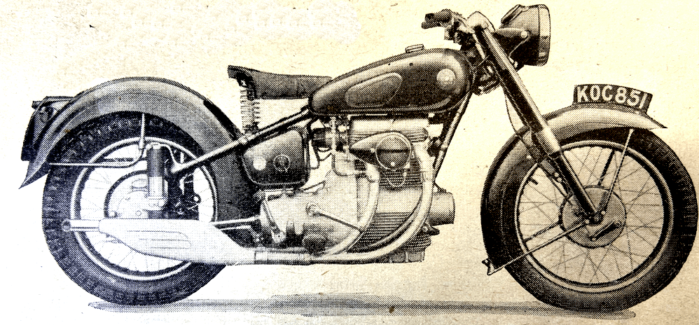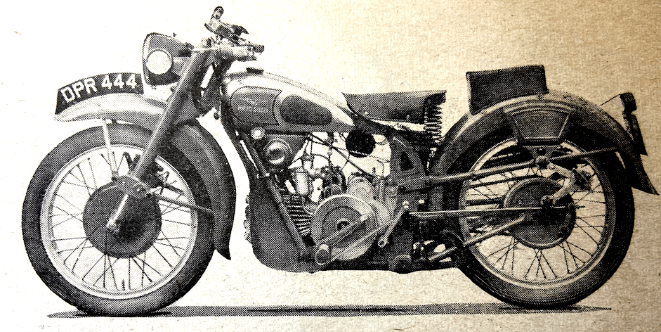 need for a leg-stretching stop. It was also a riding position which caused the rider to sit ‘over’ rather than ‘in’ the machine, thus giving absolute control at all speeds regardless of all but trials-type conditions (for which the footrests were rather too far forward). Wood blocks, tramlines and cobbles in their trickiest of moods could be negotiated with entire confidence. On the open road, corners and bends could be entered with the certain knowledge that any chosen line could be unerringly held. Straight-ahead steering was equally good at 1mph. and 30mph. The steering lock was worthy of a trials machine and very useful when turning the machine in confined spaces or when manhandling it. All controls were light and quite well placed for ease of operation although slightly less reach of the front brake and clutch levers would have been appreciated. Used together the brakes provided adequate stopping power, but the front brake was not so effective as could be desired. A rear stand is fitted for parking purposes—lifting handles on the sides of the standard rear carrier made parking easy. Fitted between the seat and chain stays on the nearside is a 3-pint oil-tank to allow a separate supply of oil to be carried. The tool-box is mounted on the opposite side of the machine. A two-compartment container, it is rather too small to accommodate both the excellent tool-kit provided and a repair outfit. Lighting is by Lucas battery and AC rectifier. The driving beam was good and allowed the use of daylight speeds after dark. The full lamp-load was never balanced by the output from the flywheel lighting coils no matter how high the engine speed. Both front and rear mudguards are of wide section and provided more than average protection in wet weather. The tank filler cap was petroil tight. Mounted on top of the front fork, the speedometer was easily read and the instrument, for all practical purposes, accurate. The finish is black with chromium plating, and the tank is gold-lined. The effect is quite distinctive and the proportion of black to chrome, tasteful.”