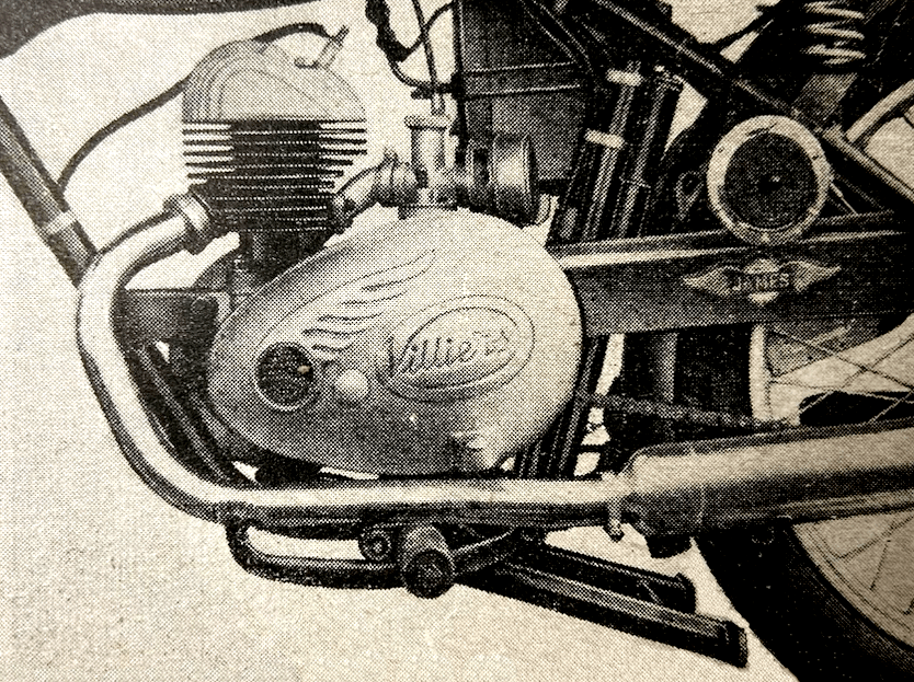 in operation. Bottom gear could always he engaged silently when the machine was stationary with the engine idling. In the early stages of the test the gear-change was rather heavy. It became lighter as the miles mounted, and at the end of 250 miles it was light enough to be beyond criticism. Neutral could be selected from either bottom or second gears without ‘fumbling’. Well placed for easy toe operation, the gear pedal had a pleasantly short travel. Gear changing was positive and easy provided that the pedal was moved with a decisive and not-too-hurried movement of the right foot. Mounted on the fork bridge, the speedometer was easily read from a normally seated position. It recorded approximately 6% fast. Lighting is by battery and rectifier, and an electric horn is fitted. The horn note was rather too weak. The driving beam provided was excellent and allowed daylight cruising speeds to be maintained after dark. No matter how high the speed after dark, the ammeter never showed that the full lamp load was being balanced. There are numerous detail features of the James worthy of special praise. For instance, the filler cap in the petroil tank remained liquid-tight even when the tank was filled to the brim. The centre stand is sturdy and easily operated, and allows either wheel to be raised clear of the ground merely by placing, say, a riding coat on either the handlebar or carrier. A carrier, incidentally, is part of the standard equipment. The tool-box is of sensible proportions and easily accommodates all that a tool-box should. Mounted in their split clamps, the handlebars are widely adjustable for height and fore-and-aft position and for angle of the grips. Footrests are adjustable through 360°. So that the silencer can be easily dismantled for cleaning, the tail pipe, complete with baffles, can be readily removed. When the kick-starter is not in use it folds neatly in and so remains out of the way. The mudguards afforded more-than-average protection in bad weather. The finish is in the colours of the famous Airborne Divisions—maroon, with a blue tank panel. Wheel rims and spokes have an argenised finish, and the exhaust pipe, handlebars, controls and head-lamp rim are chromium-plated.”