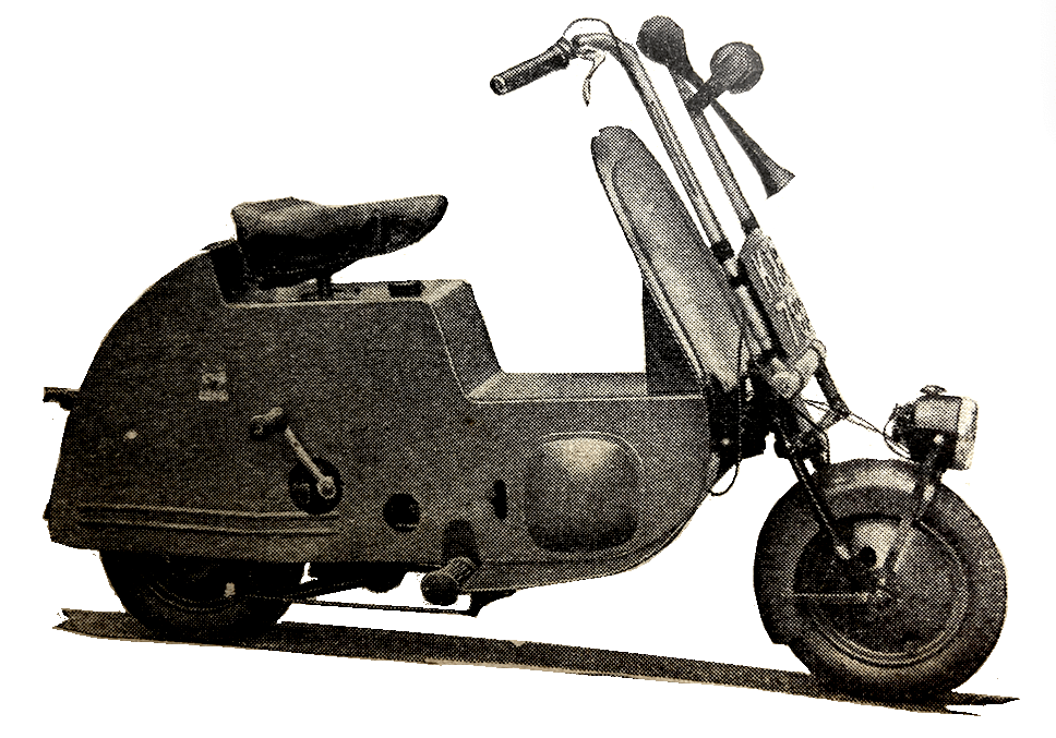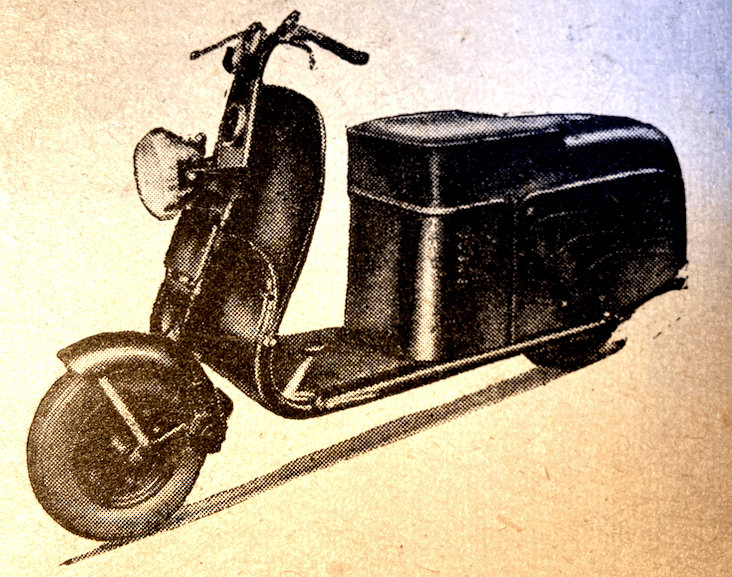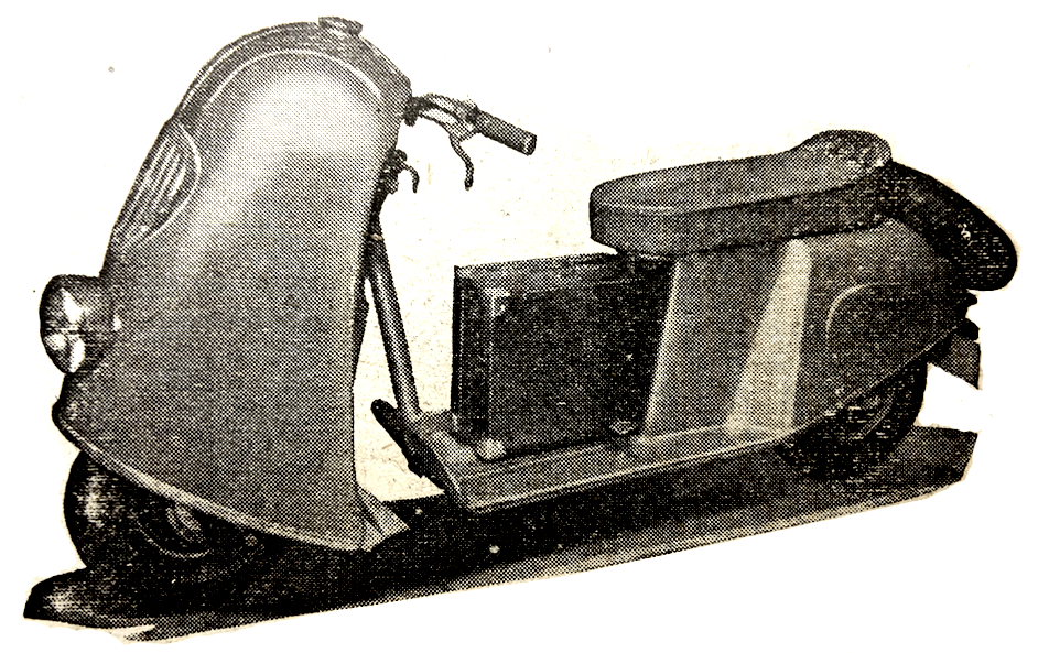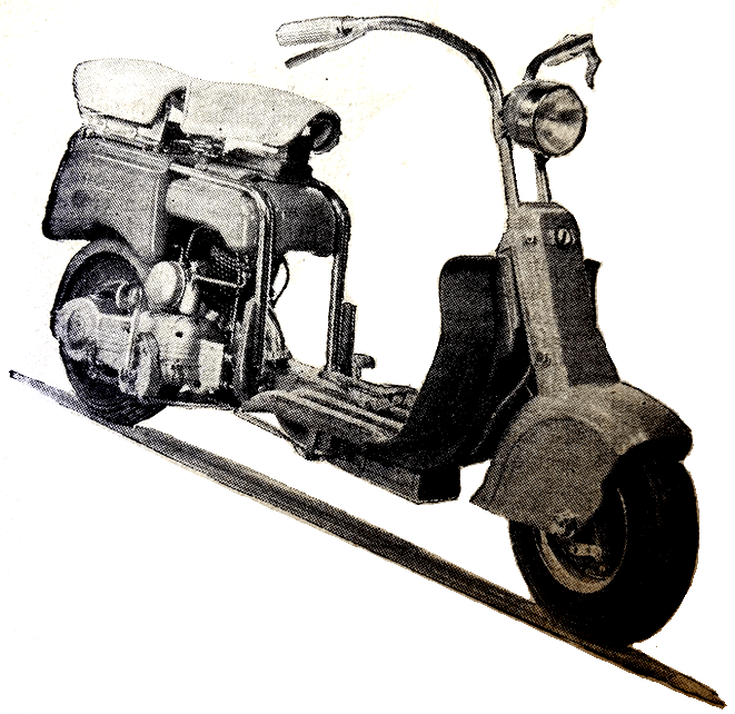 “S0 GREAT WAS the interest aroused by the Berlin Show that the period of opening was extended for three days, and daily opening hours were also extended. British machines on view included Ariel and BSA, but of course the majority of the exhibits were devoted to German products…novelty was provided by the scooters, two of which, the Autofix and the Mascottchen, are produced in Berlin. The Autofix is unorthodox in that the 120cc two-stroke engine with three-speed gear box is mounted on the front fork and the drive is by chain to the front wheel. A shapely pressing enshrouds the petroil tank and engine unit; this pressing can be readily removed or swung forward to give access to the engine. Another remarkable feature is that, after removing one nut, the fork, complete with the tank and power unit, can be detached from the chassis. This feature is a selling point in Berlin, where accommodation is scarce and owners of small machines might have to garage them in a home at the top of a flight of stairs. Suspension of both wheels is by rubber bands. The Autofix is designed to accommodate two, with luggage space in the compartment under the tandem seat. Price of this scooter is approximately £80, with the spare wheel and tyre costing an extra £3. Tubes are extensively employed for the frame of the Mascottchen, which is available with either the Lutz 58cc or the ILO 120cc engine. Soft suspension is provided, with coil springs controlling the movement of trailing links at the front and a pivoting fork at the rear. Total movement, it is stated, is up to six inches. Prices of the Mascottchen are about £50 with the Lutz engine, and £75 with the ILO three-speed engine-gear unit. Prices of some established models have been reduced in the past two months, and the strong emphasis on lower and lower prices is resulting in designs of extreme simplicity. One of the most notable in this field is the Cityfix, which sells at approximately £46. As in the case of the NSU Fox and the Imme, a ‘spine’ frame is employed. This consists of a single 1½in-diameter tube extending from the steering head and curving at the rear to form the seat tube and the mounting for the 98cc two-speed Sachs unit. The rear fork is made up of two ⅞in-diameter tubes, each of which is curved to form a seat and chain stay and welded to the main tube. Front fork is of the link type with a compression spring and pressed-steel blades. The saddle pivots at the nose and has a single, coil tension spring.”