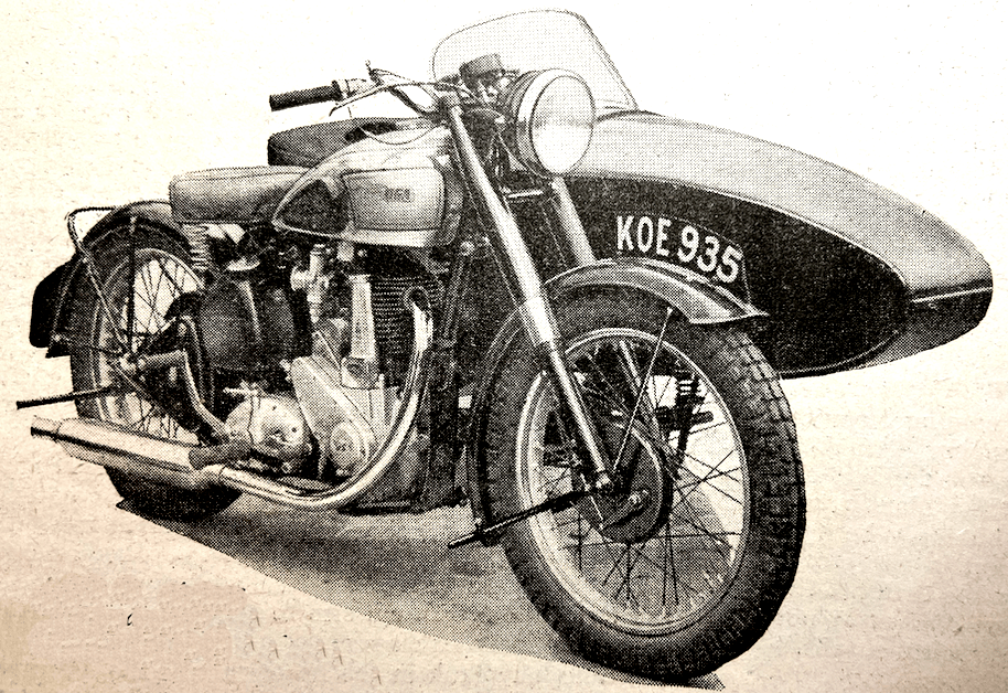 crackling exhaust note at any speed over 40mph. The exhaust, it should be added, was distinctly ‘healthy’ and may be criticised on the score that it tended to restrict the use of maximum acceleration in built-up areas. The tickover of the test engine was not 100% reliable unless the carburettor was set to give rather too fast idling on anything except nearly full ignition retard. Throughout the remainder of the throttle range the carburation was entirely clean, and the pick-up, from idling to full throttle, brisk and certain. The gear ratios were well matched to engine performance…acceleration was almost on a par with that of a 350cc solo. The positiveness of the gear change, too, was an aid to acceleration. If desired, snap changes could be made between third and top. The ratios between first and second and second and third were rather wider and a slight pause was necessary when making upward changes. Downward changes could be quickly and effortlessly accomplished between any pair of gears. Gear-pedal movement was pleasantly short and ‘taut’, and the lever excellently positioned for ease of operation. During the greater part of the test the clutch freed perfectly and was smooth and sweet in its take-up of the drive. In delivery tune there was hardly sufficient tension on the springs, and there was slip and consequent overheating when the sidecar speed figures were being taken. With the spring pressure increased, however, there was no recurrence of the bother. Lightness of the clutch operation was not noticeably impaired because of the increased spring pressure. .Highest comfortable cruising speed of the outfit was 50-55mph with a 10-stone passenger in the sidecar. While, relatively speaking, this may not be excitingly fast, 40mph averages were commonplace. Factors largely contributing to good averages were, of course, the machine’s good acceleration and excellent handling. Machine and sidecar were perfectly aligned. Normal left- and right-hand turns could be negotiated without appreciable lowering of the speed. The engine was unusually quick in the response to the throttle—a feature which made the BSA a very easy machine to drive. A pronounced tendency to pinking on hills, or when the throttle was snapped open quickly, was easily curbed by intelligent use of the ignition control; to which, incidentally, the engine was extremely sensitive. With the exception of the dip-switch (mounted on the clutch lever clamp block) all controls were well positioned for ease and speed of operation. When the ignition lever was in the full advance position, dip-switch operation was awkward since the two were too close together. The riding position was felt to be among the best of the present day. Excellent comfort, too, was provided by the BSA telescopic fork, which has just the right spring loading to suit most conditions. Rear-wheel hammer, when the machine was used with the sidecar, was hardly noticeable. In the early stages of the test, both brakes were rather too spongy. They improved with use, but