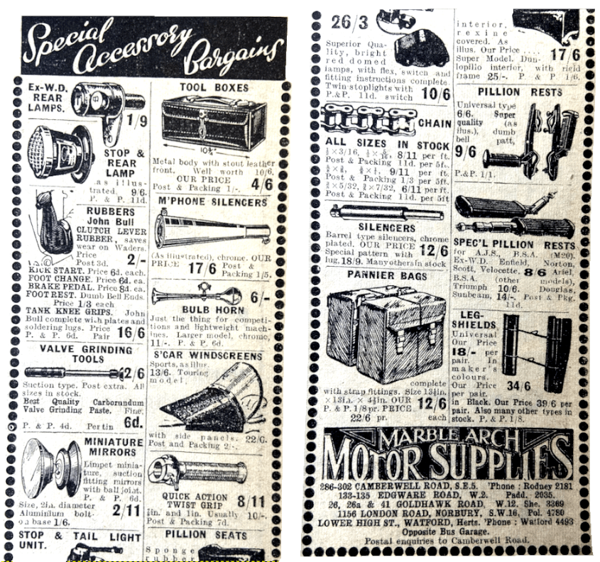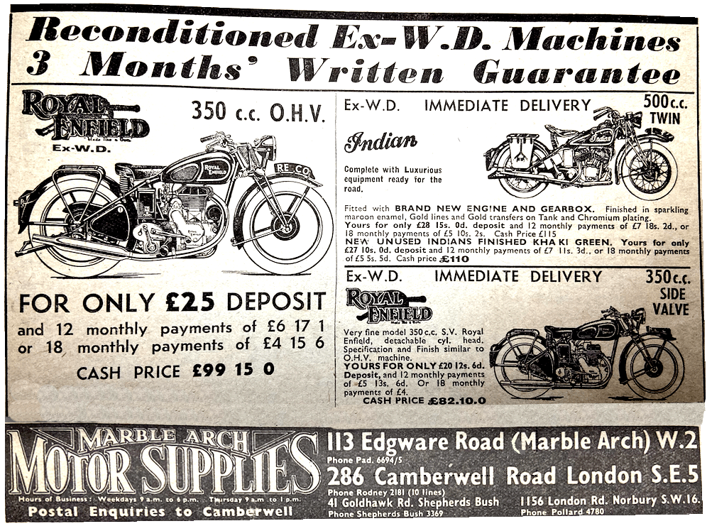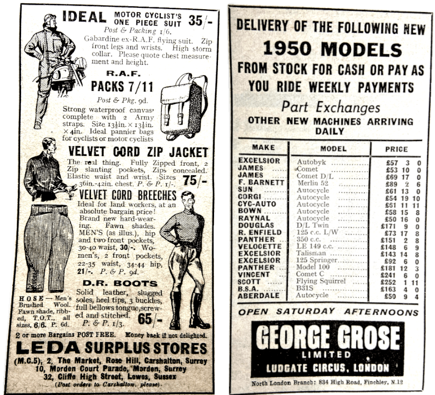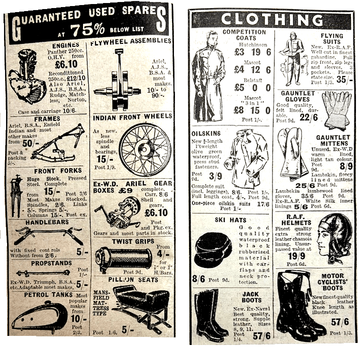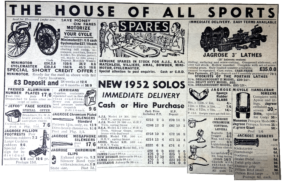 “THIS IS A TRUE STORY. Sonny: ‘Pops, can I have a motor bike?’ Pops: ‘And where d’you think the money’s coming from?’ Sonny: ‘Pops, I’ve found a beauty!’ Pops (The poor boob thinks he sees the way out): ‘HOW MUCH?’ Sonny (hopefully): ‘Only seven pounds five, pops!’ Pops (again seeing a way out): ‘WHAT’S WRONG WITH IT?’ Sonny (praying hard): ‘Nothing I can’t put right in our shed.’ Pops (seeing the third way out): ‘You’d better talk to mum!’ (One week’s interval, during which Sonny squares mum). Sonny: ‘Pops, mum says it is OK by her!’ Pops (desperately trying Way Out No 4): ‘Son, you’ve had a lot of crazes, which didn’t last long. You can have it if the shop’ll take five bob a week, and you can save the 5s yourself.’ (Interval of seventeen weeks.) Sonny: ‘Pops, here she is. Isn’t she a beaut?’ Pops (surveying a 1935 250cc very sourly): ‘You’ve never saved £7 5s in 17 weeks?’ Sonny (proudly): ‘No, pops. When I paid £6 15s, the man said he’d let me off the odd 10s.’ (Interval during which Pops paid for one new tyre, one new clutch, one new gear box, and one new cylinder, and resolved to regard ‘How much?’ as his final answer to all similar proposals.)”—Ixion