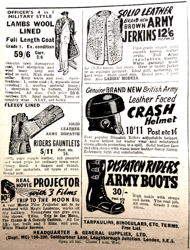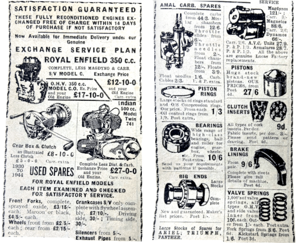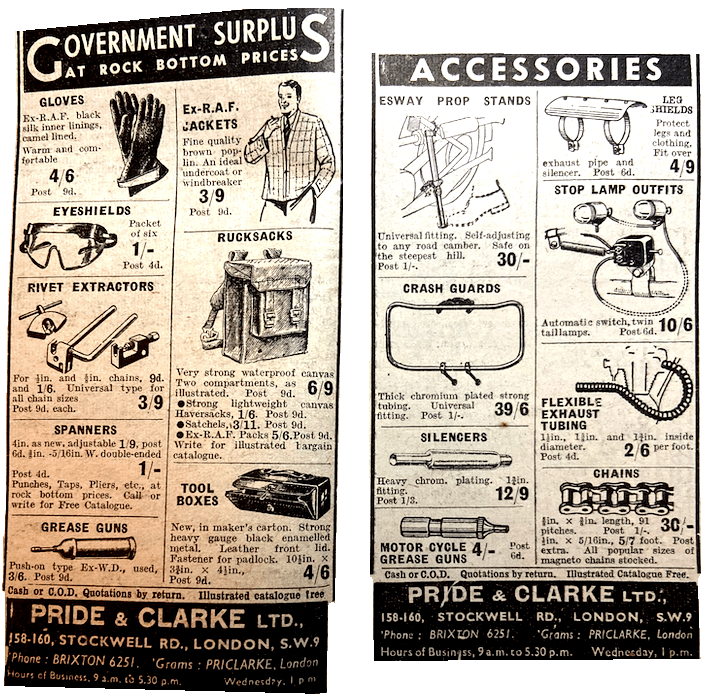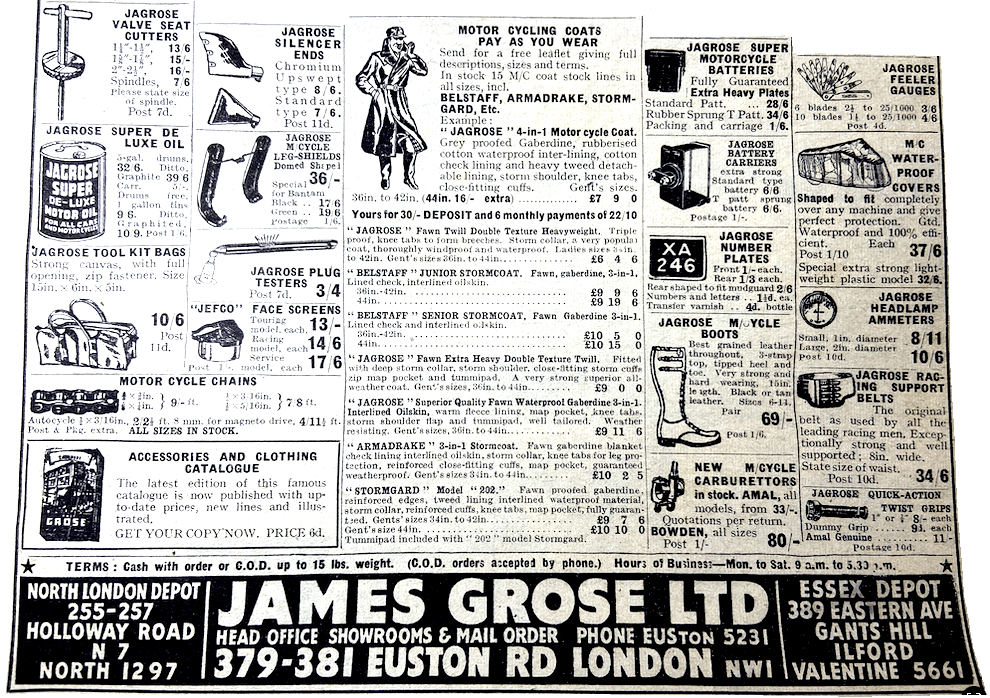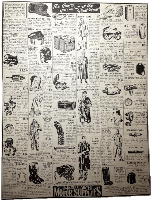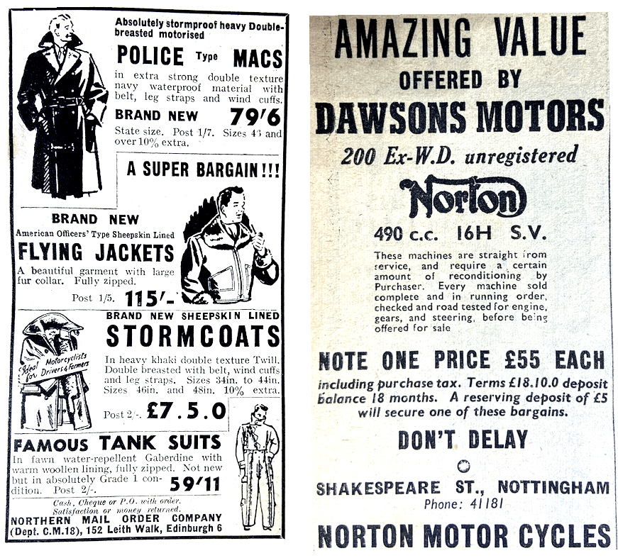 “THIS IS A TRUE STORY. Sonny: ‘Pops, can I have a motor bike?’ Pops: ‘And where d’you think the money’s coming from?’ Sonny: ‘Pops, I’ve found a beauty!’ Pops (The poor boob thinks he sees the way out): ‘HOW MUCH?’ Sonny (hopefully): ‘Only seven pounds five, pops!’ Pops (again seeing a way out): ‘WHAT’S WRONG WITH IT?’ Sonny (praying hard): ‘Nothing I can’t put right in our shed.’ Pops (seeing the third way out): ‘You’d better talk to mum!’ (One week’s interval, during which Sonny squares mum). Sonny: ‘Pops, mum says it is OK by her!’ Pops (desperately trying Way Out No 4): ‘Son, you’ve had a lot of crazes, which didn’t last long. You can have it if the shop’ll take five bob a week, and you can save the 5s yourself.’ (Interval of seventeen weeks.) Sonny: ‘Pops, here she is. Isn’t she a beaut?’ Pops (surveying a 1935 250cc very sourly): ‘You’ve never saved £7 5s in 17 weeks?’ Sonny (proudly): ‘No, pops. When I paid £6 15s, the man said he’d let me off the odd 10s.’ (Interval during which Pops paid for one new tyre, one new clutch, one new gear box, and one new cylinder, and resolved to regard ‘How much?’ as his final answer to all similar proposals.)”—Ixion