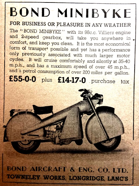 lightweight Bown motor cycle. This machine employs the Mark 1F Villiers engine. The frame is a twin-tube, cradle type, and a link-type front fork with tubular legs is employed. A 98cc autocycle is also available. This machine has a parallel-ruler action front fork with pressed-steel blades. This frame also is of twin-tube, full cradle construction, and, as is normal in autocycle practice, is of the open type. A noteworthy feature is the ample shielding to protect the rider’s clothing from the engine and rear chains• • •A new 98cc Villiers-engine two-speed lightweight called the BAC Lilliput is to reach the market early next year. Frame is of welded loop type, fitted with a telescopic front fork. The machine is