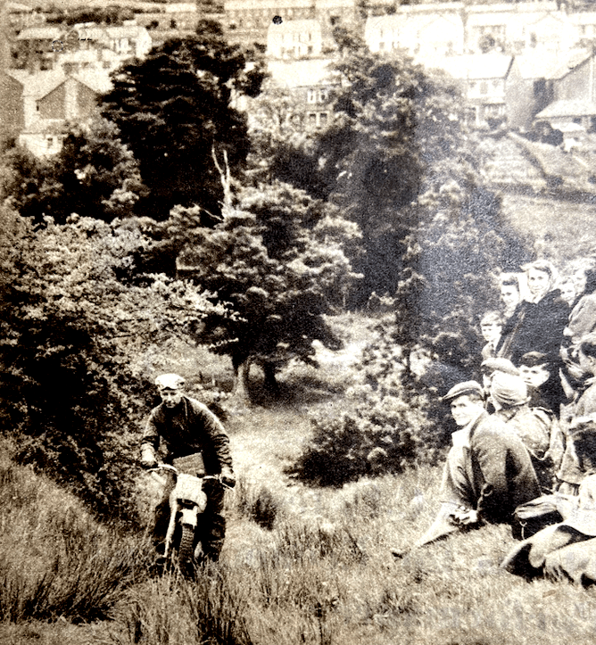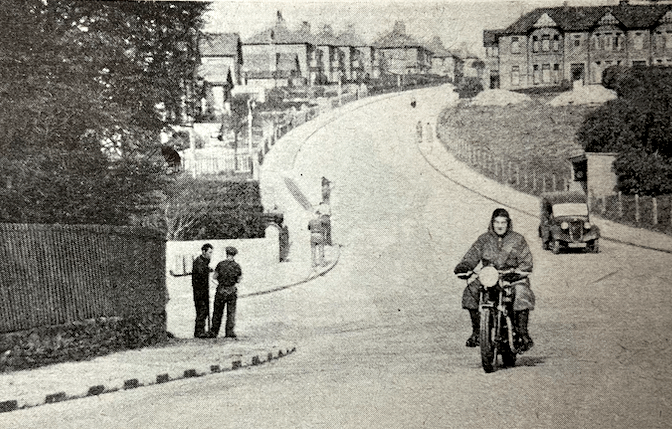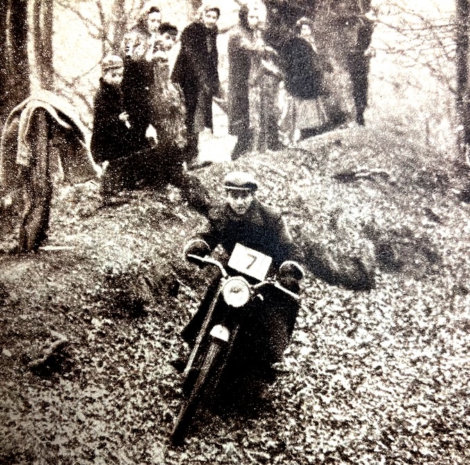 AW Jeffery (347cc AJS) toured up the hill in a most genteel fashion. Then came Mrs Anning (347cc James), secretary of the West of England Motor Club. Just round the bend, she apparently had an attack of stage-fright—it was the first observed hill—for on seeing that she was heading towards some mud, she began to lift her right foot from the footrest to give a dab; but back her foot went. Then a fast ascent, complete with power slide (not so good) by DS Ham (490cc trials Norton). The next man, FW House—entered on a Triumph—was smiling to himself, though the rigidity of his rear view after he had rounded the first bend suggested that his mien became more serious. This however, may not be fair, because on Fingle, too, he had the same smile. FC Bray (490cc Triumph) was fast, somewhat furious and, perhaps, a trifle lucky. So to Fingle Bridge which, as recorded a year ago, is a hill which looks very different now that the woods have been cut down for timber. Further, the timber hacking has altered the hill’s surface to some extent. The latter is now composed largely of loose earth and stones. For a solo, especially a lightweight, the hill is far from easy. For instance, Patrick came unstuck here with his 125, yet later conquered the towering grade that is Simms in spite of its having a slimy, slithery surface. On the latter and worse part of Fingle, the portion where the hairpin bends are both steep and specially loose, DW Jones (348cc BSA), let his speed get to little more than that required for steering way. His engine pinked, there was a nasty gully ahead and he wobbled towards the bank; then it was a case of feet and next, a full stop. GH Burnell, on a BSA of similar size, made amends with a thoroughly workmanlike climb. The next man, W Bray, on a 346cc spring-frame Royal Enfield, seemed to have a sudden attack of nerves just before the gully, but it may be that he, too, was travelling barely fast enough to have steering way. Anyhow, he also stopped, and so did AJ Nichol (Tiger 100 Triumph), but in the latter case the trouble was that Nichol went too wide at a bend and bumped his front wheel over a tree root which protruded from the bank. FT Hosking (498cc Scott) made a good showing at the bend where The Motor Cycle representative was situated, and so did AC Hosking on a Triumph Trophy model, but probably the three best to be seen here were WA White (498cc Matchless), EJ Hain (347cc AJS) and HS Harding (499cc Royal Enfield). Next on the list of hills was Simms, which, although only some 200 yards in length, has an average gradient of 1 in 3½ and a maximum gradient of 1 in 2¾—and a sharp, right-hand bend at the foot. It is thus a hill which cannot be