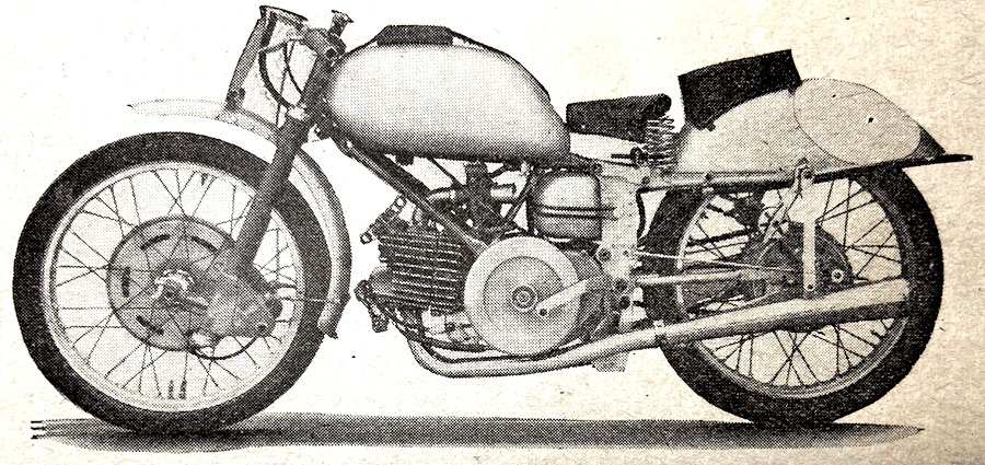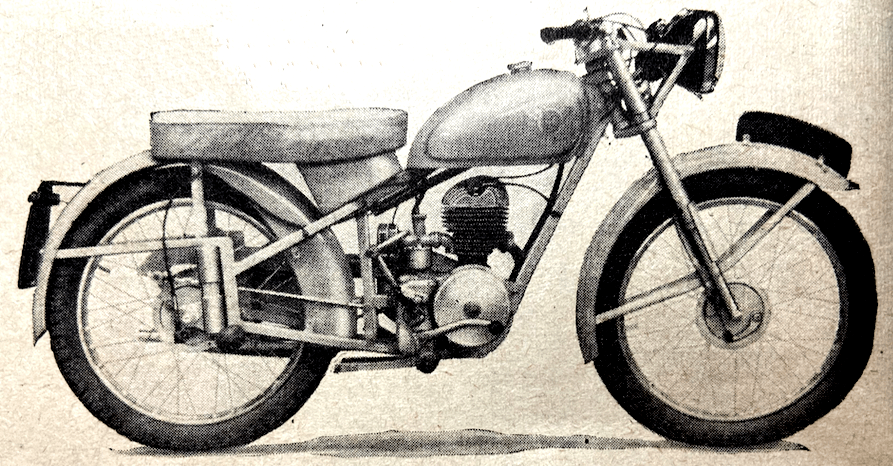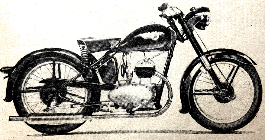“THE SPARTA FACTORIES, Apeldoorn, Holland, have announced two new lightweights which are attracting considerable attention. Both have Villiers engines, of 122 and 197cc, and are identical, with the exception of the engine-gear units and the rectifier lighting equipment and larger silencer on the 197. The general specification for these hand-some machines is as follows: Frame of welded steel tubing (0-section); hydraulically damped telescopic front fork; plunger-type rear springing; 6in diameter hubs embracing the brakes, which have internal cam-operating levers; QD and interchangeable wheels; soft top, front-suspended saddle, the springing of which is hand-adjustable; tank capacity, two gallons. Silencers can be dismantled for cleaning by removing the nut on the end of the retaining rod running through the axis of each expansion chamber. Both upper and lower chainguards are fitted; and the large-section mudguards are of attractive design. The handle-bar halves are attached to a very neat steering-head casting through which the brake and clutch operating cables are led by means of rubber protectors. The machines have strong prop-stands. Finish is black and chromium plate, but red and green plus chromium plate is optional as an extra. Tyre sizes are 19×3.00in for the 197 and 19×2.50in for the 122. Selling price in Holland is approximately £113 for the large machine and £94 for the smaller.”