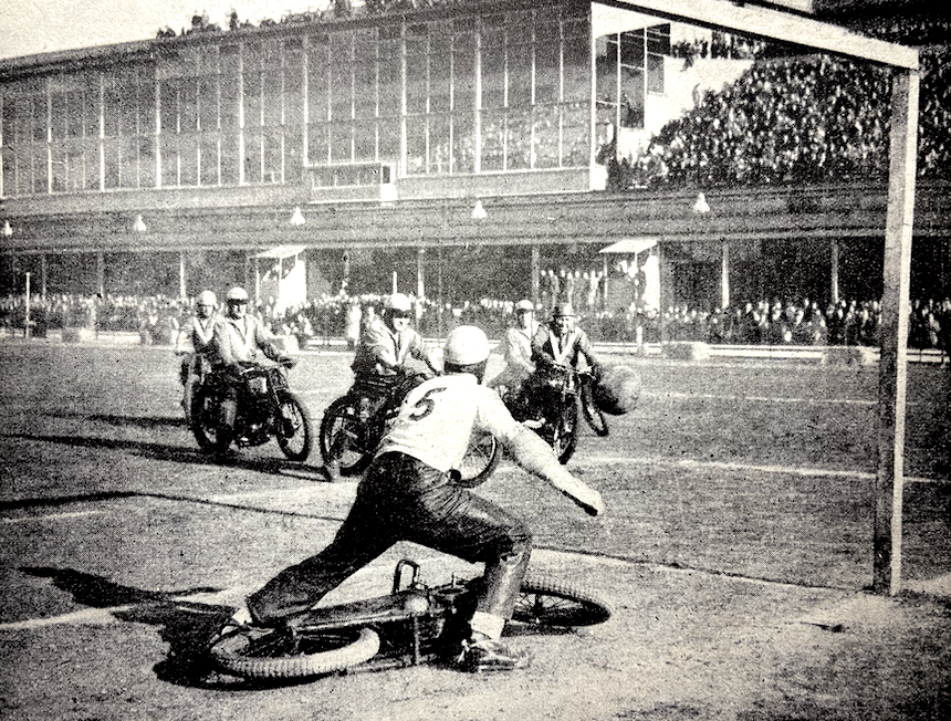 “THE FIRST MOTOR CYCLE football match was played at the Richmond (Yorks) Meet on Good Friday, March 30, 1923. The Richmond Meet was in those days an old-established event in the motor cycle calendar. There was an ACU Cup for the club having the best attendance, taking mileage and members into account. In the year mentioned, the Yorkshire Centre of the ACU had decided not to support the event. This decision served as a spur to the Middlesbrough Club, and they were looking for new ideas to keep the Meet alive. The ever inventive mind of Freddie Dixon, who was in those days a member of the committee, suggested that a motor cycle football match would prove an attraction; and so this form of sport was born. Incidentally, as I write, I have just been talking to Freddie. He is paying a visit to the Middlesbrough Club’s headquarters, and we have been refreshing our minds on incidents of the old days. I have in my scrap-book newspaper cuttings describing the original match, and caricatures of some of the people who took part, one of whom was George Butt Craig, who wore riding breeches, stockings, a jersey with a red and black vee-shaped stripe on the upper portion, and a bowler hat from which the crown had been removed and on which:the rim was worn upside down. The Middlesbrough Club went from strength to strength and took part in the Camberley Rodeo mentioned by your correspondent, which, according to my records, was held on Monday, August 5, 1924. We have in the possession of the Club the Camberley Cup which was won on that occasion. The sport took on, and we issued a set of rules and received applications from many parts of the British Empire for copies. The ACU gave a cup and the Knock-out Competition was promoted. The. Middlesbrough Club succumbed in the final to the Coventry Ace team on the Headingley Ground at Leeds in 1927, after the match had been abandoned at the Crystal Palace, London. I was not at the Camberley Rodeo, but I recollect our members referring to the jump made by Bonzo Heath on his Henderson.