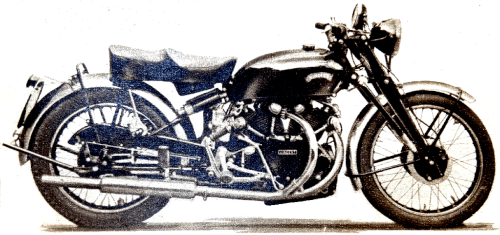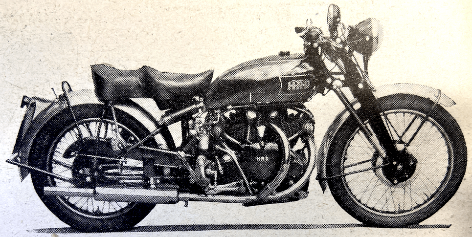 “MERE MENTION OF THE NAME ‘BLACK SHADOW’ is enough to speed the pulse. Since the machine’s introduction last year as a super-sports brother to the already famous Rapide, the sombrely finished ‘Shadow’ has achieved wide distinction. It is a connoisseur’s machine: one with speed and acceleration far greater than those of any other standard motor cycle; and it is a motor cycle with unique and ingenious features which make it one of the outstanding designs of all time. So far as the standards of engine performance, handling and braking are concerned—the chief features which can make or mar an otherwise perfect mount—the mighty Black Shadow must be awarded 99 out of 100 marks; 99 because nothing, it is said, is perfect The machine has all the performance at the top end of the scale of a Senior TT mount. At the opposite end of the range, notwithstanding the combination of a 3.5 to 1 gear ratio, 7.3 to 1 compression ratio and pool quality fuel, it will ‘chuff’ happily in top at 29-30mph. Indeed, in top gear without fuss, and with the throttle turned the merest fraction off its closed stop, it will surmount average gradients at 30mph. In Britain the machine’s cruising speed is not only limited by road conditions, it is severely restricted. It is difficult for the average rider in this country to visualise a route on which the Black Shadow could be driven for any length of time at its limit or
