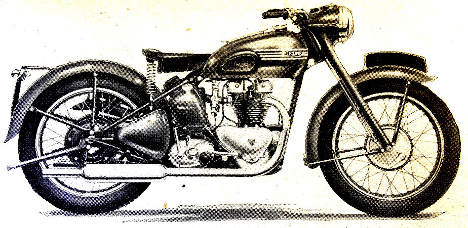 similar to the 122cc Supaglid, except that it has a 197cc Villiers engine-gear unit. Both these machines have a twin-tube cradle frame and pivoting-fork rear suspension. Operation of the rear fork is controlled by a 4in-long synthetic-rubber cartridge placed horizontally under the rear of the engine unit. All models of the range have the Tandon telescopic front fork. The third model, the 122cc Milemaster, has a rigid frame and the Mark 9D, 122cc Villiers engine-gear unit is employed. Gear change is by hand and direct lighting is standard. The Supaglid models are available in various polychromatic colour schemes• • •Always a popular sporting roadster, the Triumph 1951 Tiger 100, modified with the aid of a conversion kit supplied by the makers for £35, can be made a ‘week-end racer’. It is claimed that this model is more potent than the ‘Grand Prix’ which it replaces. Power output of the engine in standard form is stated to be 33bhp. The conversion kit can also be applied to the Trophy model, with which the Triumph trials and scrambles riders have made such a good impression. The kit comprises a set of pistons (available for pool petrol, petrol-benzole or alcohol fuels); racing camshaft (vernier-type three-keyway timing wheels enabling accurate setting are standard on all 1951 models); racing valve-springs; twin mixing chambers with manifold and single remote float chamber; megaphones with small