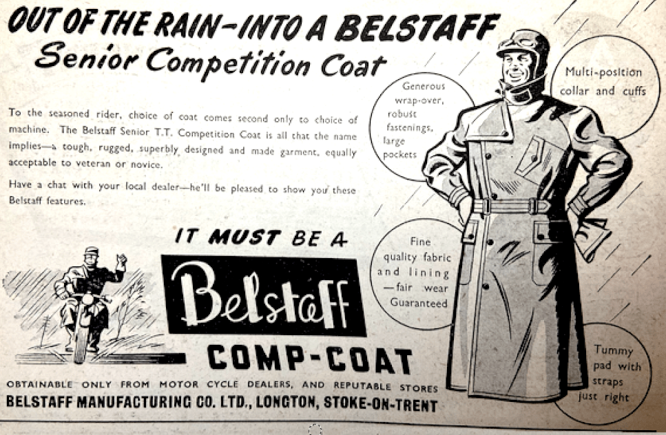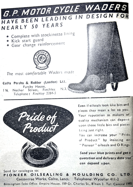 “OUR LEADING ARTICLE of December 8 drew much-needed attention to the defects of too many mudguard layouts. One reader snorted when I showed it to him in proof. ‘A car gets just as dirty,’ he declaimed; ‘look at a Rolls after a dirty run! Its flanks will be plastered to a height of a couple of feet, and you could plant seedlings on its stem far higher up than that!’ True! But we must separate the allied problems of machine-cleanliness’ and ‘rider-cleanliness’. The Rolls may need a long wash, but its occupants can step out spotless. With standard mudguarding a motor cyclist after a dirty run over mixed roads will usually be mud-plastered about knee-high on his legs, and almost neck-high on his back. His nether portions can be kept clean by adding legshields and perhaps some form of footboard (note the LE Velocette). His back could be kept clean, but few standard guards will effect this. No method of keeping the machine clean is known—or even dreamt of. Blow-back off the front guard; mud-fling off the front tyre; suck-back due to the vacuum behind the rider’s body; mud-fling from the rear tyre: guards can reduce these, but nothing can eliminate them. Finally, the side-fling from every vehicle which he passes at short range will foul both his model and his person, no matter how efficient design might become. For he sits low in relation to the road…little research has been definitely focused on this mud nuisance. Even the best standard guards could probably be improved by intelligent and vigorous designing effort without cluttering up the model overmuch. Ease of cleaning is a more promising ideal than averting all the mud from the model. No rider will ever be able to step off a model fit for a ballroom or a fashionable restaurant, so special clothing will always be a ‘must’ in bad weather (unless we accept a Roe monocar with a convertible lid—which we shan’t). But it is one thing to get moderately dirty and quite another to collect an appreciable amount of damp filth distributed over legs and back. Finally, any solution should surely be applied to the lightweights, whose buyers desire protection far more than the roadburners.”—Ixion
