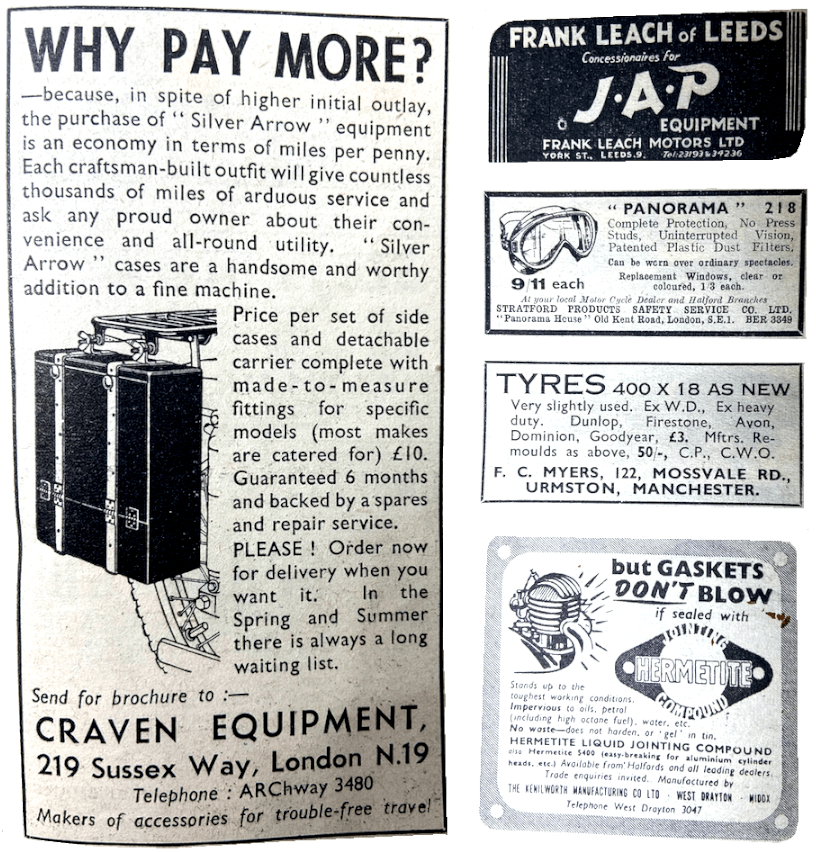 “AUGUST TRADITIONALLY IS THE SILLY SEASON, the period when busybodies, carping critics and any others whose vapourings may bestir controversy are allotted space in sections of the lay press. Pillion riding is among the targets in several journals this year. It should be banned, one is informed. Yes, and, further, all motor cycles should be barred from entering a tram-infested area, because they skid on tramlines! There is no suggestion that trams and their lines should have been scrapped years ago, as indeed was promised, nor that it is utterly disgraceful that there should still be highway surfaces which prove treacherous when wet. To-day there are nearly 700,000 motor cycles registered. The movement is stronger numerically than it has been for 20 years. Silly season though it is, motor cyclists should take up cudgels against stupid attacks upon the economical motor cycle.”—Ixion