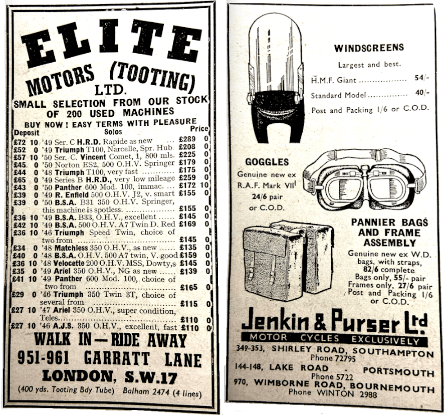 “I HAVE READ, with much interest, the recent letters by various readers denunciating Mr Terry Saunders and his opinion of women as drivers. I feel it is now time I wrote and gave my opinion, which I cannot express really correctly owing to censorship of certain words I should like to use. I can only say I agree 100% with Mr Saunders, and I personally would not trust myself on the back of my 1,000cc Vincent Rapide with the most expert woman rider in the world. My own wife, by her own admission (fortunately), would not take hold of the front seat position for all the money in the world, but give her the rear and she will ride until the wheels drop off. In a recent run to Skegness this holiday I covered 288 miles in one day, and during the run I encountered seven separate cases of very bad and dangerous driving; fortunately, four of them, although occurring whilst I was travelling at a fair speed along long, straight stretches, occurred in the distance, allowing me to drop speed and pass the offending vehicles with the greatest of caution. For no apparent reason each of these four different cars swerved right across from one side of the road to the other and back again, on straight, flat stretches of road. If at that precise moment I had been overtaking, I should either have had to brake hard or hope my bike would just scrape through the bit of space between car and grass verge. The other three cases occurred in towns. In each ease the offender swung off to the right with not the slightest of signals to give a following driver any warning. Now what is rather ironical about all these seven cases is that in every case I remarked to my wife, ‘I guess that is a woman driving that car,’ and, believe it or not, when passing I found my guess right every time. This occurs constantly in my daily driving—it is not just one isolated day’s experience, so perhaps you will understand when I say, in my opinion, Mr Terry Saunders is dead right in saying keep the woman on the pillion and off the driving seat of a car. The remark by one reader about the pillion being less comfortable, and therefore a, reason why a change over of positions is fair, is ruled out if a dual seat is fitted similar to the type fitted to the Vincent, as the rear rider has as much comfort as the front. I would like to add I am a driver with 19 years’ experience behind me, and in all that time I have had my opinion forced on me daily by the women drivers themselves with their constant lack of road sense and driving ability.