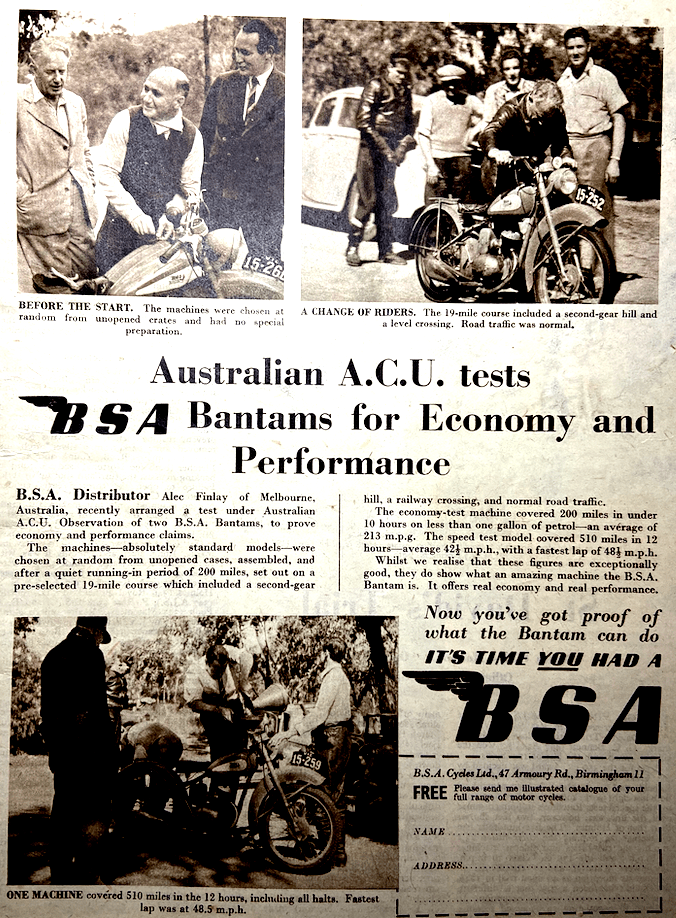 “IF THE YOUNG enthusiasm for midgets ultimately wilts a little under the ruthless searchlight of prolonged experience, it may very well be succeeded by a possibly saner enthusiasm. Meditate a moment on the BSA Bantam, which is ploughing a most promising furrow. It is not cheap, as lightweights were cheap before the aftermath of war steepled the prices of all commodities. But it is definitely a go-anywhere machine. Except in terms of speed, or for riders too long in the leg and too corpulent in the tummy, it can hardly be faulted. If man’s aim is the greatest happiness of the greatest number, the production of machines accessible to the multitude is a great step forward.”