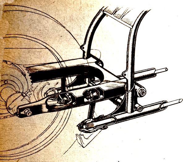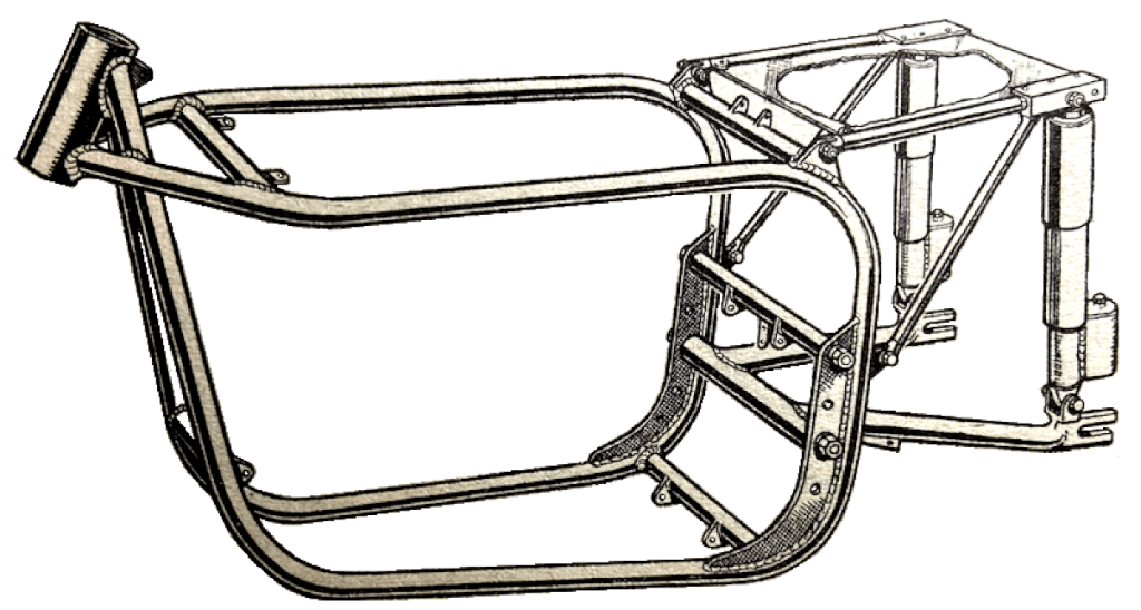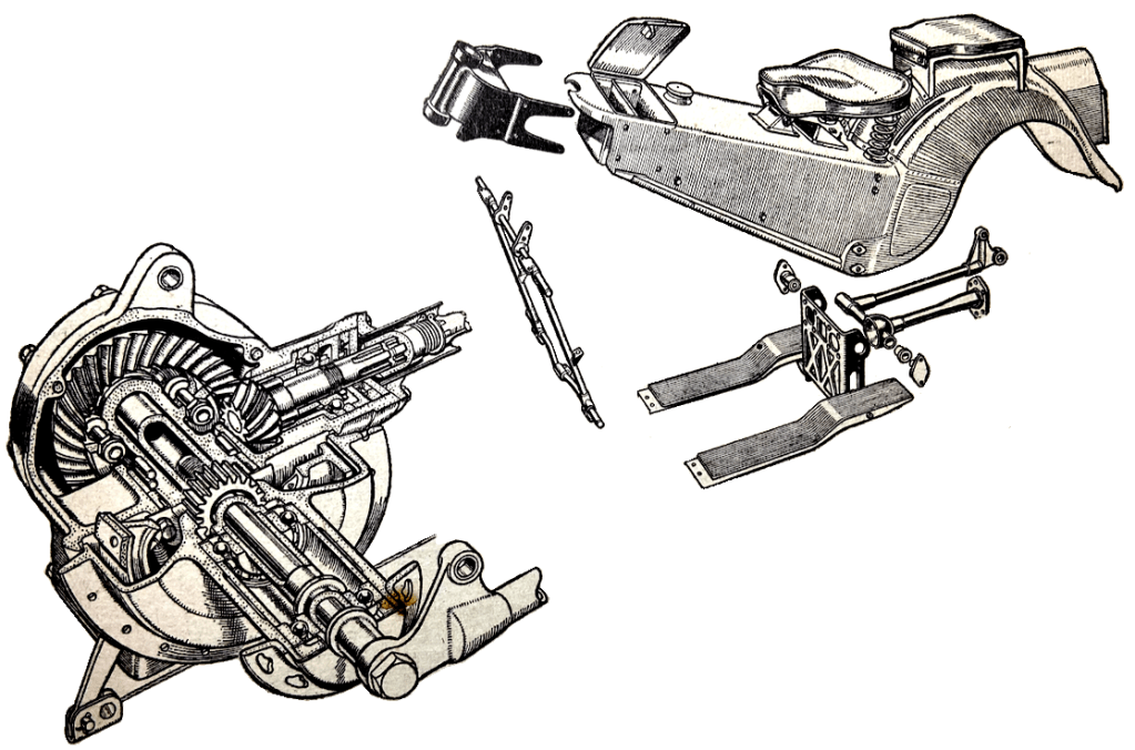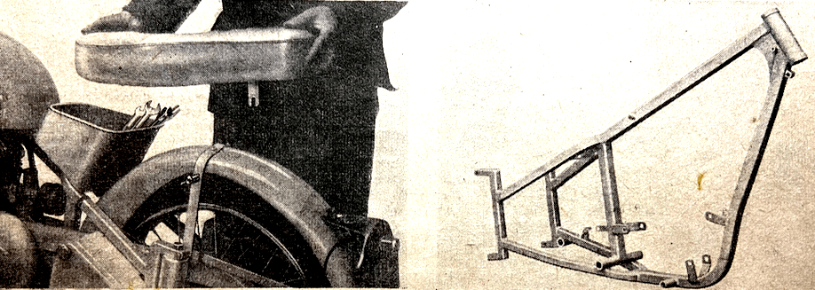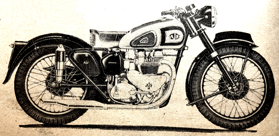 “WHO WOULD HAVE IMAGINED that the race-tested AMC spring-frame, now available for both single-cylinder and twin-cylinder AJS and Matchless machines might have emerged as a fabricated, part-pressed, part-tubular frame incorporating some very attractive features relating to tank, seat and air filter mountings and to the housing of electrical equipment and tools? In fact, in that constant striving for progress for which the really ‘live’ manufacturer is notable, a prototype was made and extensively tested at the Woolwich works, and the design is protected by Patent No 631,946 in the names of Associated Motor Cycles and Mr PA Walker. Application date was July 23, 1946, and the complete specification, just published, was accepted on November 14, 1949. A box-section sheet metal beam, at its forward end attached to the steering head, extends to the rear and takes the place of the top tube in a conventional frame. The tail of this beam fits between the side members of a sheet-metal ‘saddle’ which replaces the orthodox seat tube. Various methods of securing the components of the beam and ‘saddle’ are provided for in the patent, and it is even suggested that they might be formed integrally. The material might be sheet steel, though Duralumin is stated to be preferable. The beam is straddled by the fuel tank, which, resting on a soft insulating material, is held in place by one long bolt passing through the beam and screwing into an inset nut in the crown of the tank tunnel; an alternative method of attachment provides for a bolt through a bridge-piece across the base of the tunnel, abutting on the underside of the beam and keeping a tank projection in register with a seating in the upper face of the beam. Across the two rails, formed at the top of the ‘saddle’ is a duplex seat of the type now fitted as standard on the Matchless Super Clubman Twin. Rear ends of the rails form the attachment for the telescopic legs of the suspension. The fork carrying the rear wheel pivots in lugs which are attached to the side-members of the ‘saddle’ and which may be cast or built up. To these lugs are attached the cradle tubes of the frame. Transversely mounted across the side-members is the oil-tank; this forms an additional bracing member. A passage through the oil-tank registers with the carburettor air intake. This passage communicates with a semicircular duct leading up to a filter mounted between the rails of the ‘saddle’. On this point the patent specification says, ‘The object of the passage and duct is to provide an easy path of flow for air into the engine and a confined space immediately in alignment with the carburettor venturi passage, so that liquid fuel which is normally ejected at certain engine speeds by blowback resulting from valve-opening overlap may be trapped and contained in an air column that is subsequently drawn into the engine. A certain degree of fuel economy is thus assured.’ Obviously the side panels of the ‘saddle’ could be fitted with doors giving access to containers. The patent specification envisages one container to house the battery and small electrical equipment, and the other for tools. This design gives food for thought. A frame made up of tubes and sheet metal is by no means new in conception—some Italian designers have favoured this type for many years—but when the light-alloy sheet is applied as in the AMC patent it should result in great strength with weight-saving and give a cleaner external appearance to the machine.”