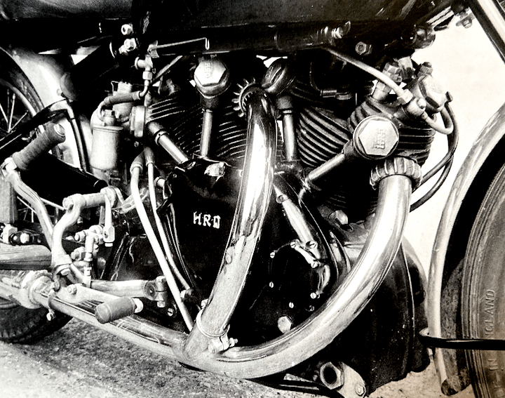 The footrests are sufficiently high to allow the rider complete peace of mind when the machine is heeled over to the limit, and were sufficiently low to provide a comfortable position for the 5ft 7in rider’s legs. Now famous, the 25½in from tip to tip, almost straight, Vincent-HRD handlebar provides a most comfortable wrist angle and a straight-arm posture. All controls are widely adjustable—the gear pedal and brake pedal for both height and length. Both these controls, incidentally, move with the foot-rests when the latter are adjusted. The gear change was instantaneous but slightly heavy in operation. Snap gear changes could be made as rapidly as the controls could be operated. The clutch freed perfectly throughout the test and bottom gear could be noiselessly selected when the machine was at standstill with the idling. However, because of the pressure required to raise the pedal it was sometimes necessary to select neutral by means of the hand lever on the side of the gear box, and also to engage bottom gear by hand. In the 700 miles of the road test the tools were never required. In spite of the high speeds there was no apparent sign of stress. Primary and rear chains remained properly adjusted. There was very slight discolouring of the front exhaust pipe close to the port and a smear of oil from the base of one of the push rod tubes on the rear cylinder. The ammeter showed a charge at 30mph in top gear when all the lights were switched on and the road illumination was better than average. An excellent tool-kit is provided and carried in a special tray under the Feridax Dualseat. There are many ingenious features of the Vincent-HRD which brand it as a luxury mount built by highly skilled engineers who at the same time are knowledgeable motor cycle enthusiasts. The Black Shadow finish is distinctive, obviously durable and very smart; and only a minor reason why the ‘Shadow’ attracts a crowd of interested passers-by wherever it is seen!”