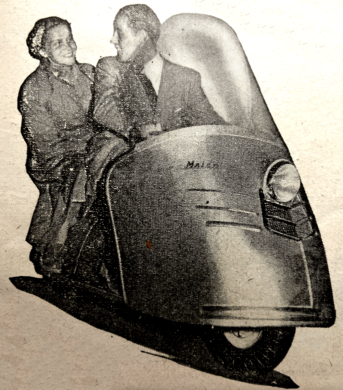 “I MUST SUPPORT your correspondent, Terry Saunders, who, to my mind, is quite correct in his statements, despite the one-sided onslaught. I agree with his saying the ‘average’ girl is not really interested in motor cycling; it is merely a means of transport. Her idea of a good machine is really amazing. If it looks like a juke box and sounds like a vacuum cleaner, it represents the last word in engineering skill. Regarding the girl taking the pilot’s seat with her male companion ‘sheltering’ benignly behind her, reminds me of that well-known axiom ‘If a thing looks right, it usually is.’ To my mind nothing could look more out of place. Lastly, motor cycling is first and foremost a man’s sport, so I will also say ‘Keep off the front seat, girls.’