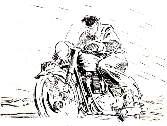 “‘I’M SURE THAT what the aged parent needs’ (or words to that effect), wrote my mother, ‘is to see you again.’ Those who know me and hold that I am no Adonis might raise an interrogative eyebrow at such a statement. Be that as it may, it needs no second hint to speed a Wilson to the sick-bed of a pining parent. But before I left I cast a baleful eye at the ten-tenths cloud and guessed that there was dirty weather ahead. When I’m in the saddle for something like nine hours at a stretch I like to be (a) dry, and (b) warm. So I didn’t hesitate to buckle on my screen and muffs before setting off, especially as it was still early in the year. Did I say ‘in the saddle’ for something like nine hours? That’s not strictly true. From my home, near Redditch, to my parents’ home in Kirkcaldy (Fife, Scotland, for those whose geographical education is incomplete) I clocked 377 miles on the outward run, and nine hours means an average of under 40 miles an hour—I’m not that slow. However…It was 10.30am when I donned coat and waders, and 10.35 when I started up the Triumph. Though the outlook, as I said, was dull, I had high hopes—and, in any case, I was prepared for the worst. It was just as well. I covered the first 62 miles to Nottingham in disappointingly slow time, since I had to cross Birmingham from south to north, and the road thereafter is one that only permits the use of the upper part of the throttle for short spells. There was intermittent rain as I rode between ancient Ashby-de-la-Zouch and Nottingham. In Nottingham I ran into a deluge! I was more pleased than ever that I’d fitted the screen and muffs, especially since I emerged with dry hands and gloves. I patted my back metaphorically for my forethought and cracked on as hard as I could. At Bawtry I joined the Great North Road, A1—for me the most romantic road in Britain. Where else in the world are there such thrilling signposts—To The North, Scotch Corner, Scotland, Edinburgh, and so on? The Triumph went like a bird, as if knowing jolly well it was going to Scotland: Shangri-la, Paradise, Heaven, the Isle of Man, and Blandford all rolled into one. Here on A1 the Triumph’s performance could be used and the needle was held pretty steadily on 80mph (about 73mph actually, I should say) on the straights. The average climbed. Came Scotch Corner and I had mentally to flick a coin. The question was, to continue on A1 or go to Carlisle? There’s little in it as regards distance, I mused, and with about 200 miles behind me I would prefer the road with the better surface—better, that is, as regards comfort. I plonked for Al—and regretted my decision for nearly every mile afterward. Traffic was interminable and I took a wrong turning in Newcastle. Built-up area followed built-up area. I gradually saw myself getting not the six o’clock ferry across the Forth but the 6,30, then the seven o’clock. It began to rain again, and a gale blew up as I ran along the coast between Belford and Berwick, then towards Dunbar. The daylight faded and I pressed on all I could, though by now I knew (my muscles kept telling me) that I had over 300 miles behind me. The cockles of my heart, however, became warmer and warmer… Edinburgh at last—wet and dark and in a far from welcoming mood. It was ten minutes past seven, so I decided that there would be no halt, however brief, and that I should get the 7.30 ferry. At 7.20pm I dropped down the steep hill into South Queensferry, to find that the ferry was not at the quay and not even in sight! Realisation dawned. It was still winter, according to the ferry schedules, and there was only an hourly service. Forty minutes to wait in a drizzle is a dull prospect, but it was brightened by the sight of a cafe nearby where, I was informed, I could have tea,