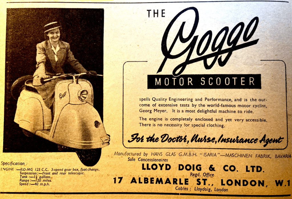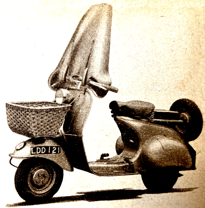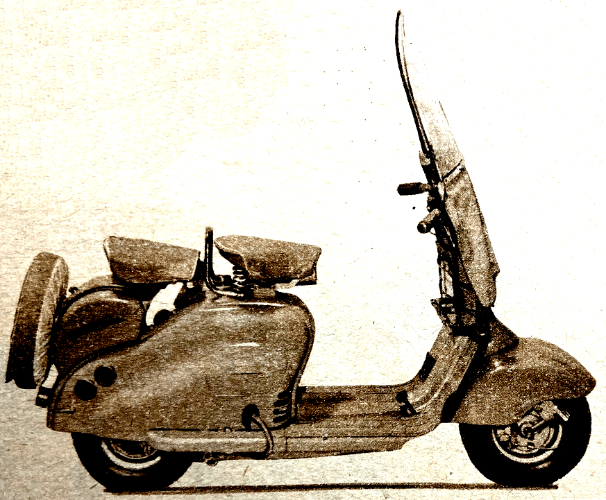 direct lighting. The de Luxe has rectifier lighting and rear springing; it can also be equipped with a new twin-seat, which makes the model an admirable passenger machine. Probably the biggest draw on the Stand is the new 197cc Colonel—an out-and-out sports machine intended for trials work. This machine is a replica of the model ridden with such success by WA Lomas, and its specially prepared engine is stated to develop over 8bhp at 4,000rpm. Most fittingly, an illuminated board carrying photographs of the Colonel in action is mounted over the model. On the Continent scooters are rapidly increasing in numbers. One of the earliest and best-known post-war designs, the Lambretta, has achieved nation-wide popularity in Italy (the country of its birth) and is also being made under licence by the vast NSU concern in Germany. Particular interest, therefore, attaches to the Lambretta scooters exhibited at Earls Court—quite